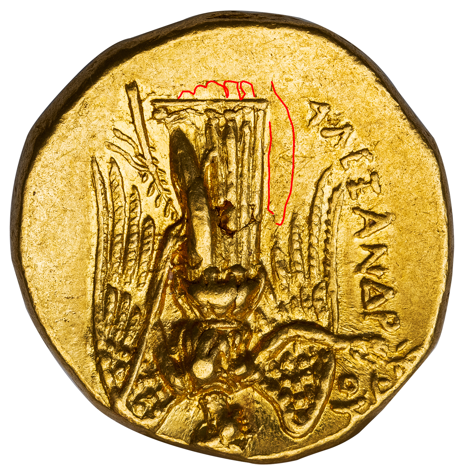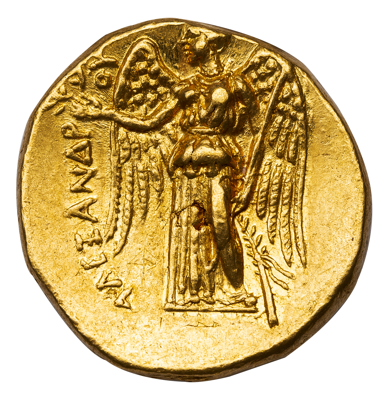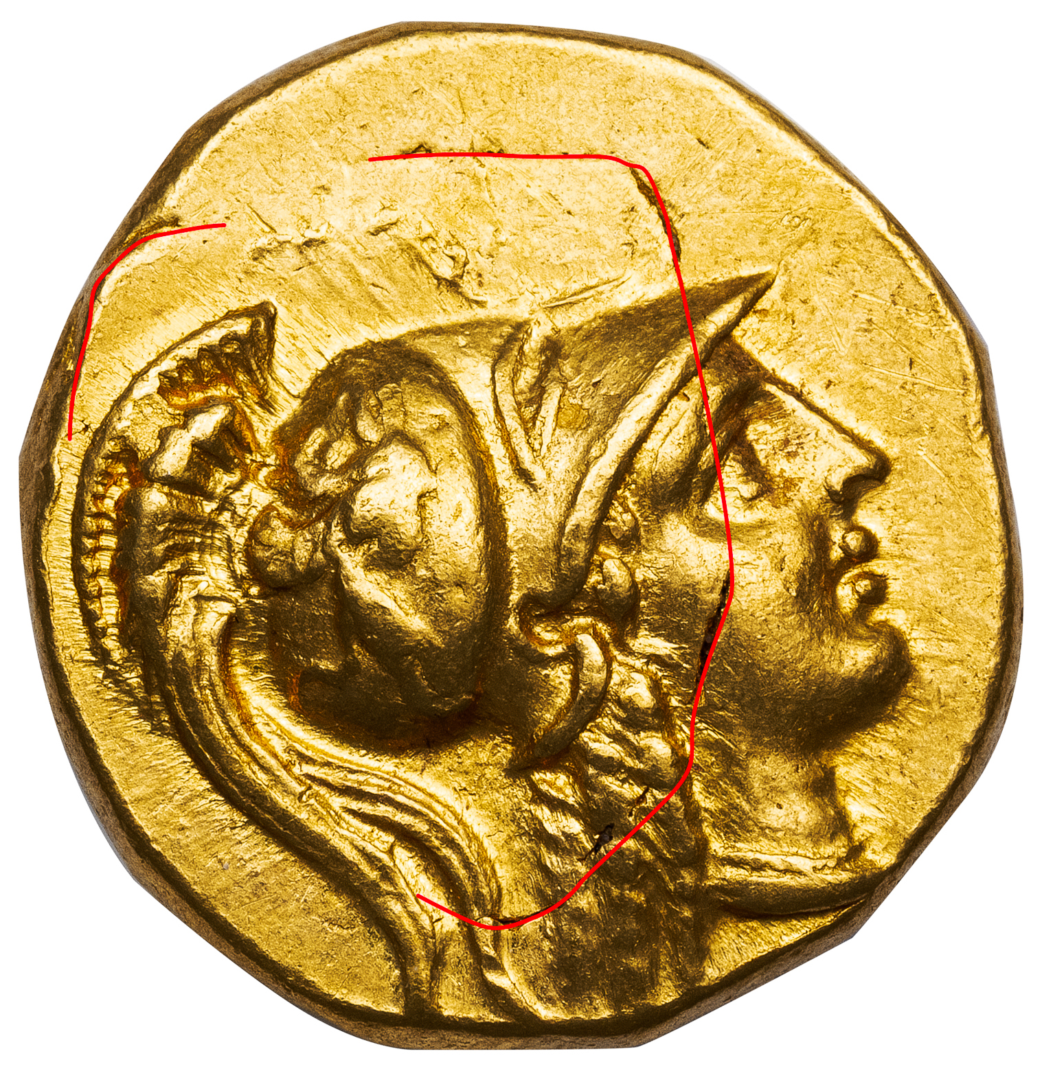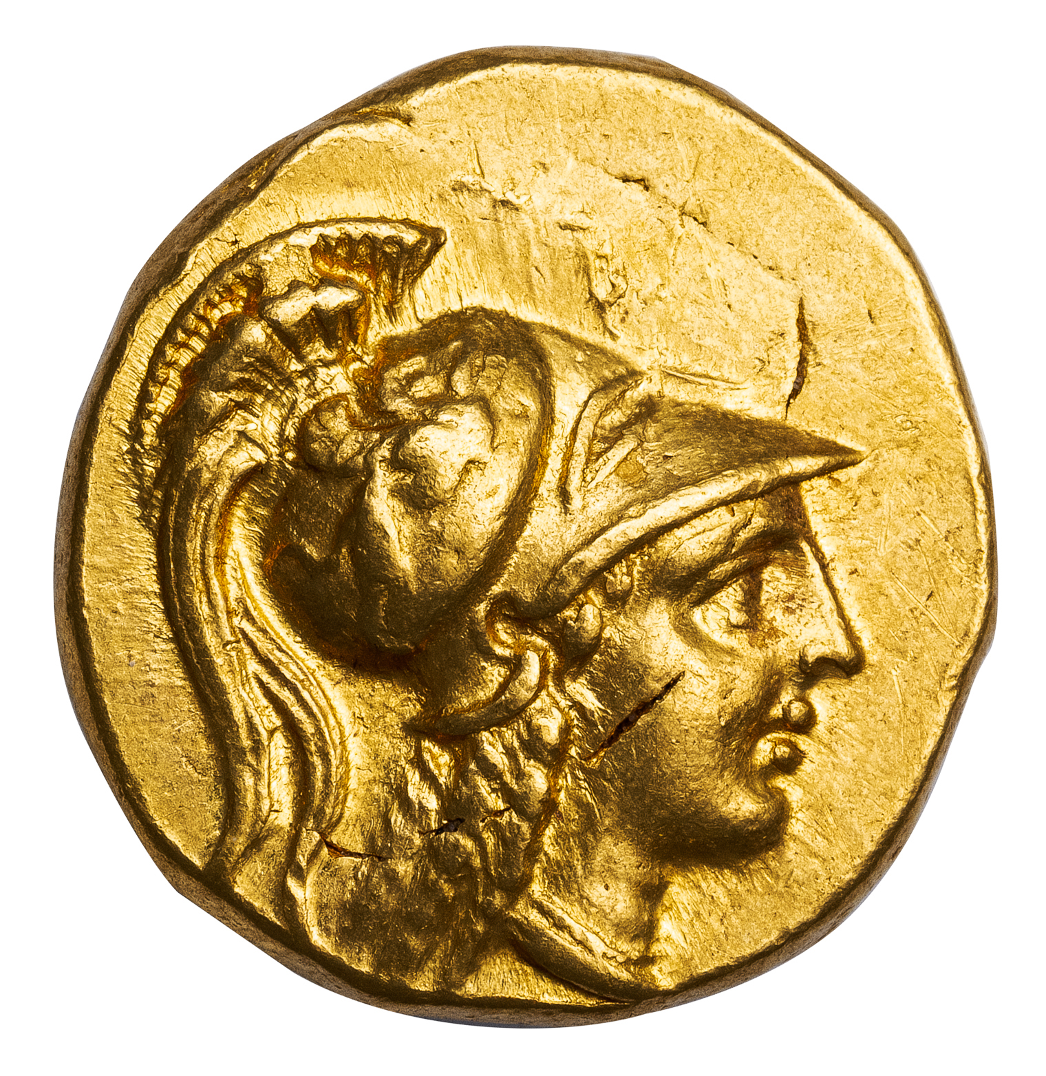This stater is especially remarkable as it is clearly overstruck on a Persian daric. The outline of the daric’s oblong incuse punch reverse remains visible in part around the top of Athena’s head and cuts across her cheek. The reverse, carefully viewed after rotating the Nike 180 degrees so her feet are up, reveals flattened traces of the daric’s obverse, primarily the king’s crown and bow. This evidence of overstriking goes far toward proving that this issue was indeed struck from the Persian coins captured by Parmenion at Damascus.