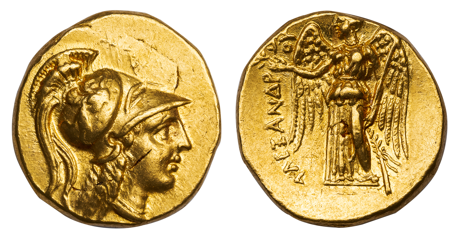 Obv. Head of Athena right, wearing large Corinthian helmet with lion-griffin ornament below the plume. Rev. ΑΛΕΞΑΝΔΡΟΥ, Nike standing, looking left, holding wreath in right hand and stylis over left shoulder, filleted branch below right wing.