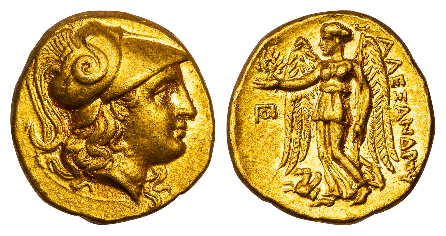 Obv. Head of Athena right, wearing large Corinthian helmet with coiled snake ornament below the plume. Rev. ΑΛΕΞΑΝΔΡΟΥ, Nike standing, looking left, holding wreath in right hand and stylis over left shoulder, PO monogram in left field, Pegasus protome below left wing.