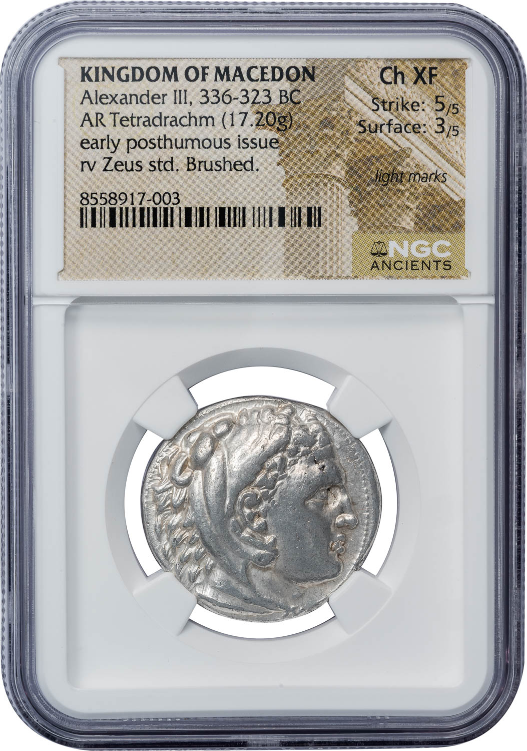 ALEXANDER THE GREAT SILVER TETRADRACM – POSTHUMOUS ISSUE OF AMPHIPOLIS – CHOICE XF NGC GRADED KINGDOM OF MACEDON COIN (Inv. 20804)