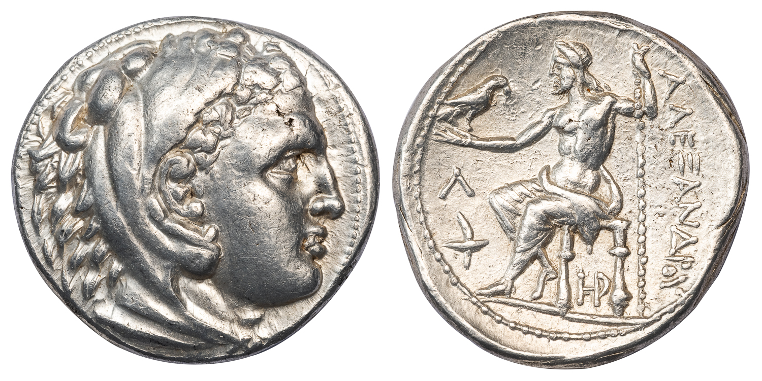 Obv. Head of young Heracles right in lion skin headdress. Rev. ΑΛΕΞΑΝΔΡΟΥ, Zeus enthroned left, holding eagle and scepter, Λ above torch in left field, HP below throne.