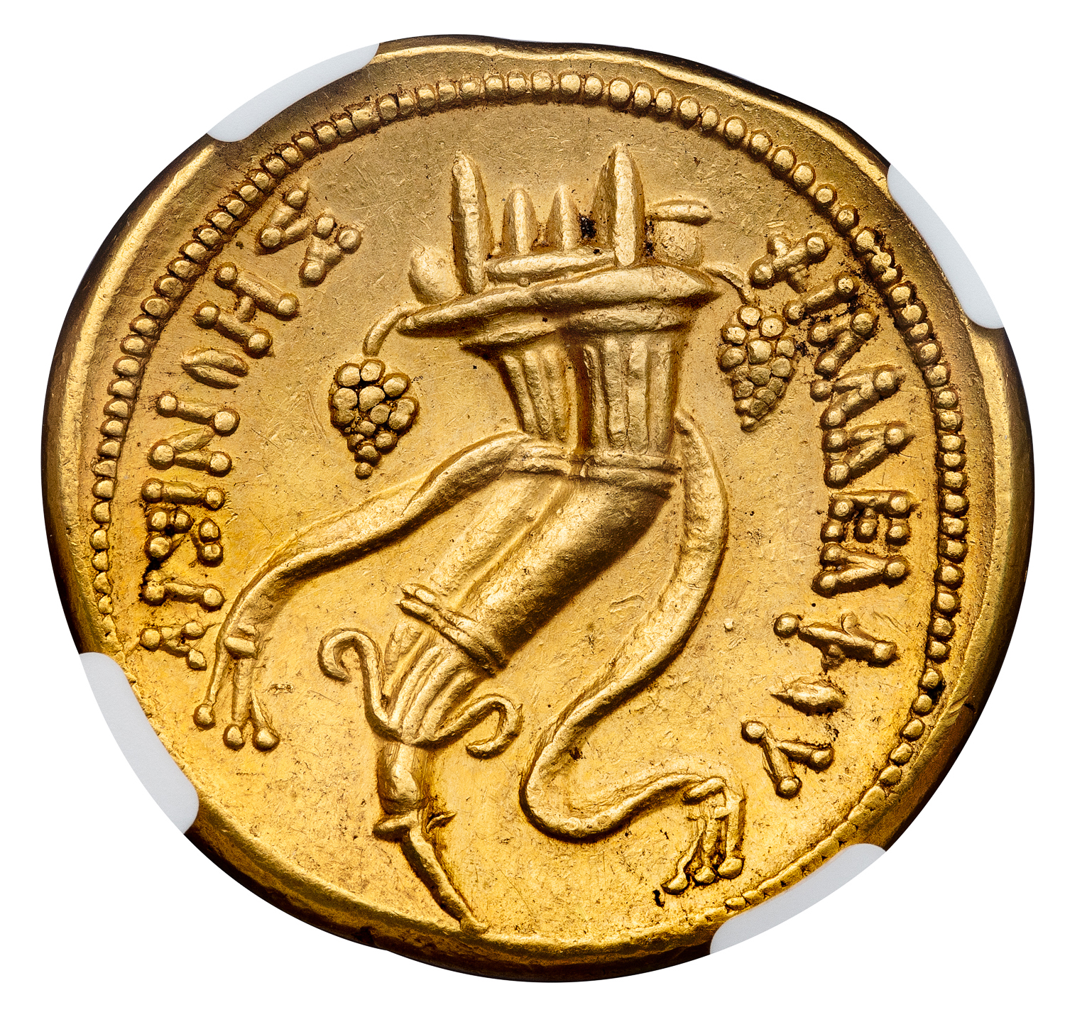 Gold Mnaieion (Octodrachm), 27.24 g, 29 mm. Issue of Alexandria in the name of Arsinoe Philadelphus, attributed to the reign of Ptolemy VI, ca. 180-145 BC.