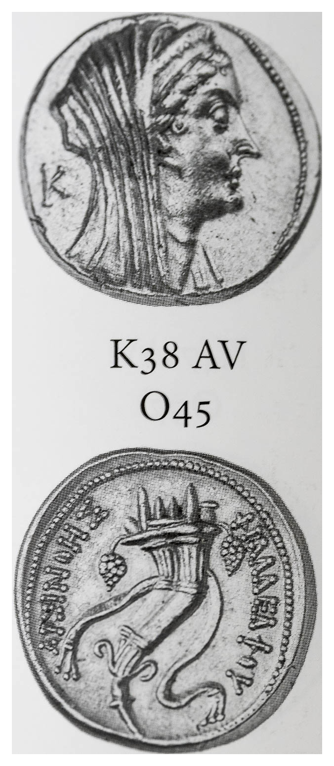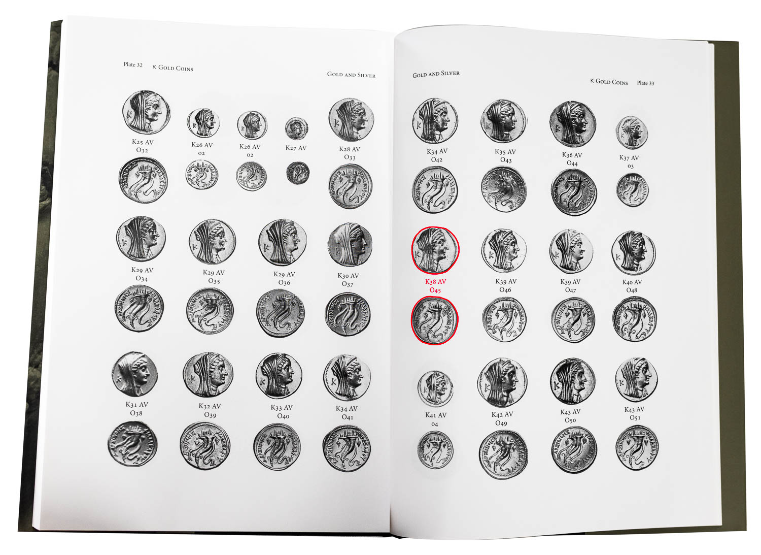 Although the types and legends of this issue refer to Arsinoe II, the wife of Ptolemy II Philadelphus (284-246 BC), the style and the K control on the obverse indicate production in the second century BC. It has been proposed that the obverse portrait actually represents Cleopatra II, who ruled Egypt at various times with her brother-husbands, Ptolemy VI Philometor and Ptolemy VIII Euergetes II, and in her own right. The letter K has occasionally, but almost certainly wrongly, been interpreted as the Greek numeral 10, indicating the tenth regnal anniversary of the queen. More probable is the suggestion that the K serves as the initial letter of Cleopatra to identify the portrait.