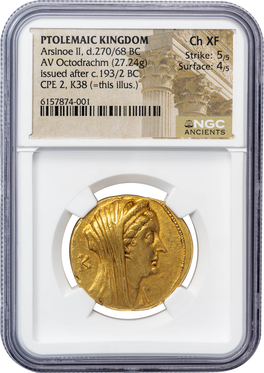 ARSINOE II GOLD OCTODRACHM – ISSUE OF PTOLEMY VI PLATED IN CPE 2 – CHOICE XF NGC GRADED GREEK PTOLEMAIC KINGDOM COIN (Inv. 20838)