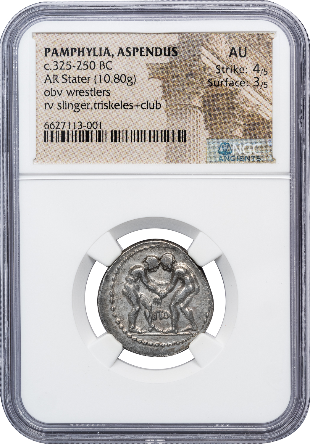 ASPENDUS SILVER STATER – RARE ISSUE WITH ΠO AND CLUB SYMBOLS – AU NGC GRADED GREEK PAMPHYLIA COIN (Inv. 20538)