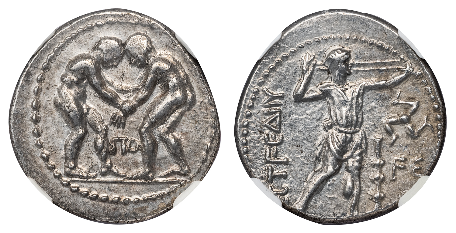 Obv. Two wrestlers in combat, ΠO between. Rev. Slinger in throwing stance to right, triskeles in right field, club in lower right field.