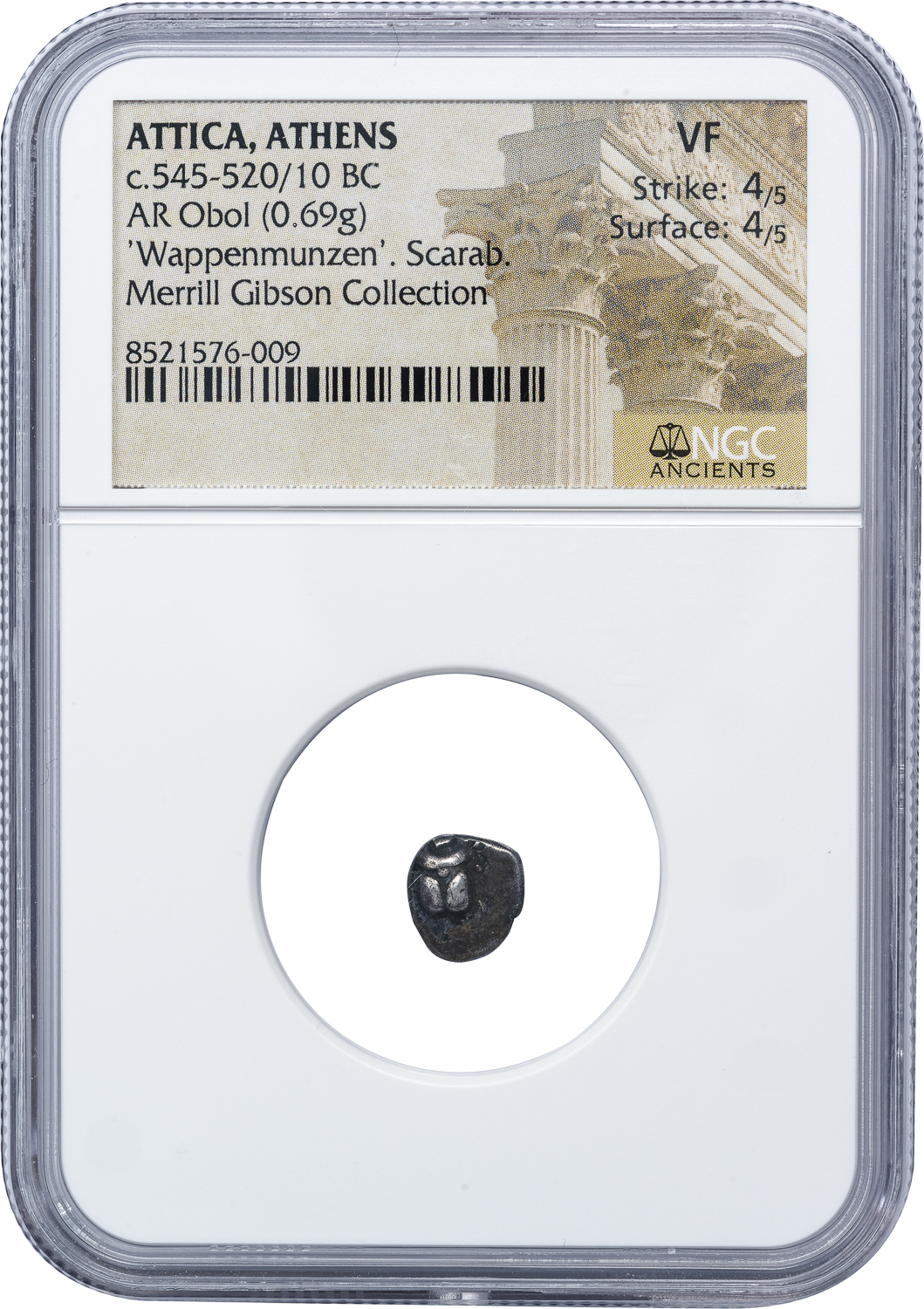 ATHENS WAPPENMUNZEN SILVER OBOL – SCARAB ISSUE ILLUSTRATED IN HGC – VF NGC GRADED GREEK ATTICA COIN (Inv. 20560)
