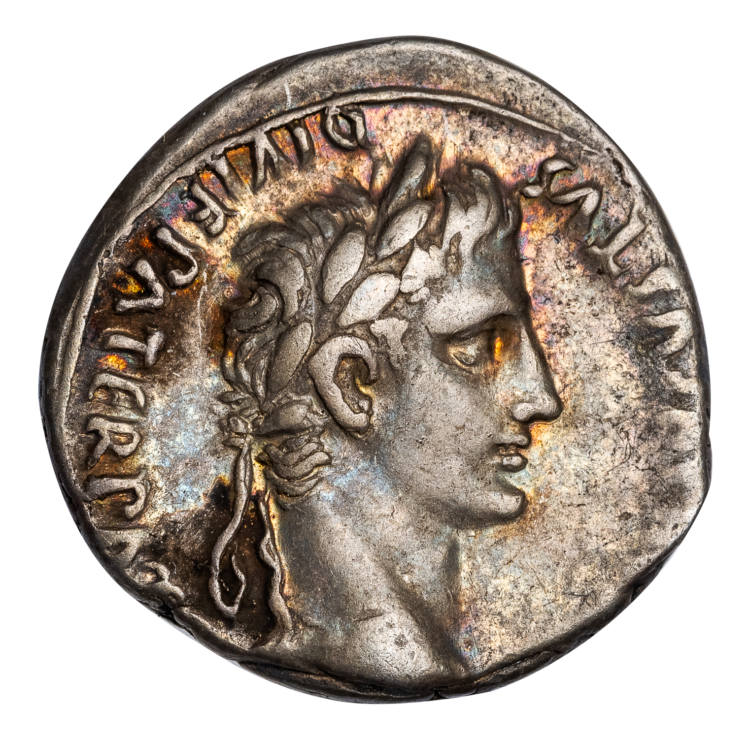 AUGUSTUS SILVER DENARIUS – LUGDUNUM ISSUE WITH GAIUS AND LUCIUS CAESAR – VF IRIDESCENT ROMAN IMPERIAL COIN OF THE 12 CAESARS (INV. 20860)