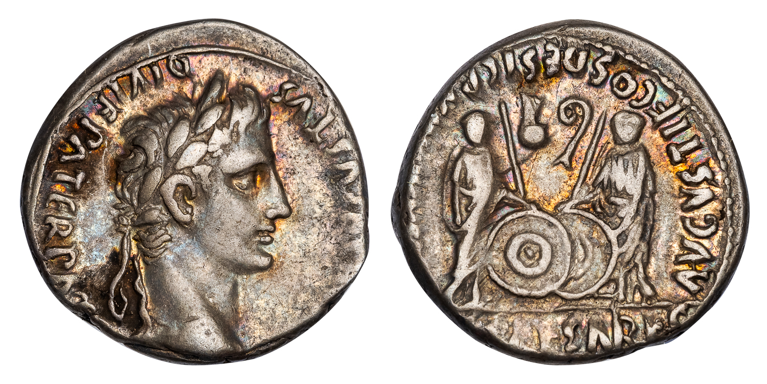 Obv. [CAESAR] AVGVSTVS DIVI F PATER PAT[RIAE], laureate head of Augustus right. Rev. AVGVSTI F COS DESIG [PRINC IVVENT], Gaius and Lucius Caesar, standing, facing, holding shields and spears, [C L C]AESARES in exergue.
