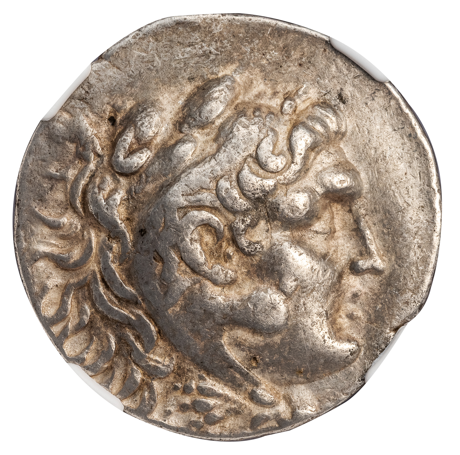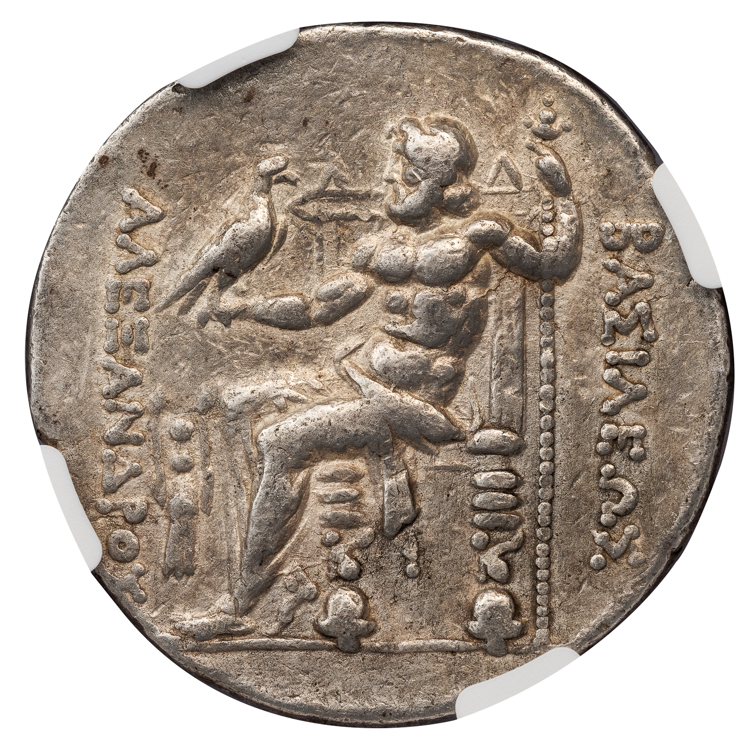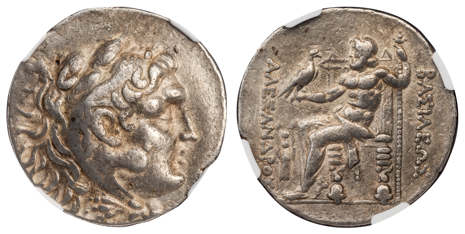 Obv. Head of young Heracles right in lion skin headdress. Rev. ΒΑΣΙΛΕΩΣ ΑΛΕΞΑΝΔΡΟΥ, Zeus enthroned left, holding eagle and scepter, Artemis Phosphoros standing facing, holding two torches, in left field.