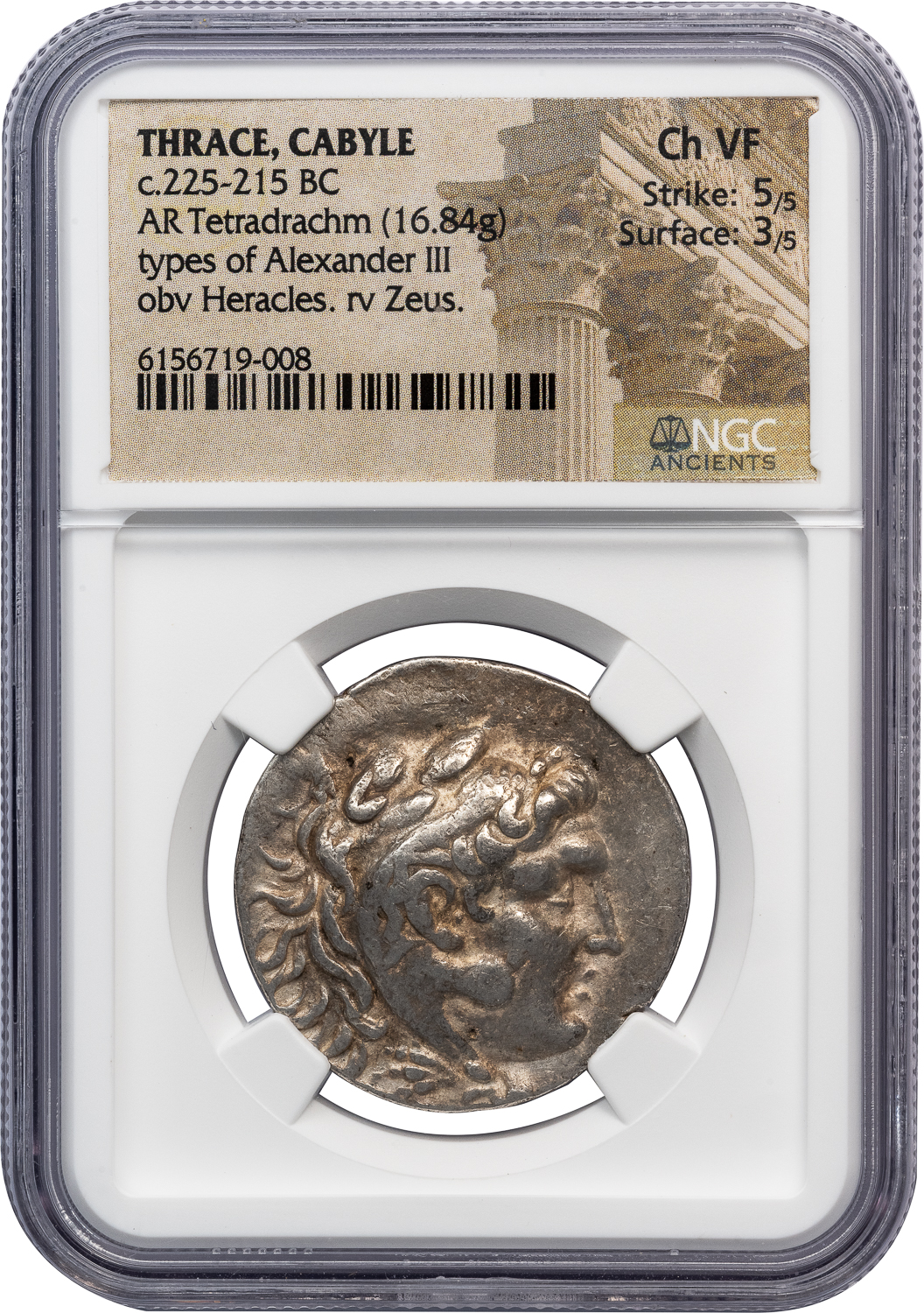 CABYLE SILVER ALEXANDER TYPE TETRADRACHM – RARE EMISSION WITH ARTEMIS PHOSPHOROS – CHOICE VF NGC GRADED GREEK THRACE COIN (Inv. 21171)