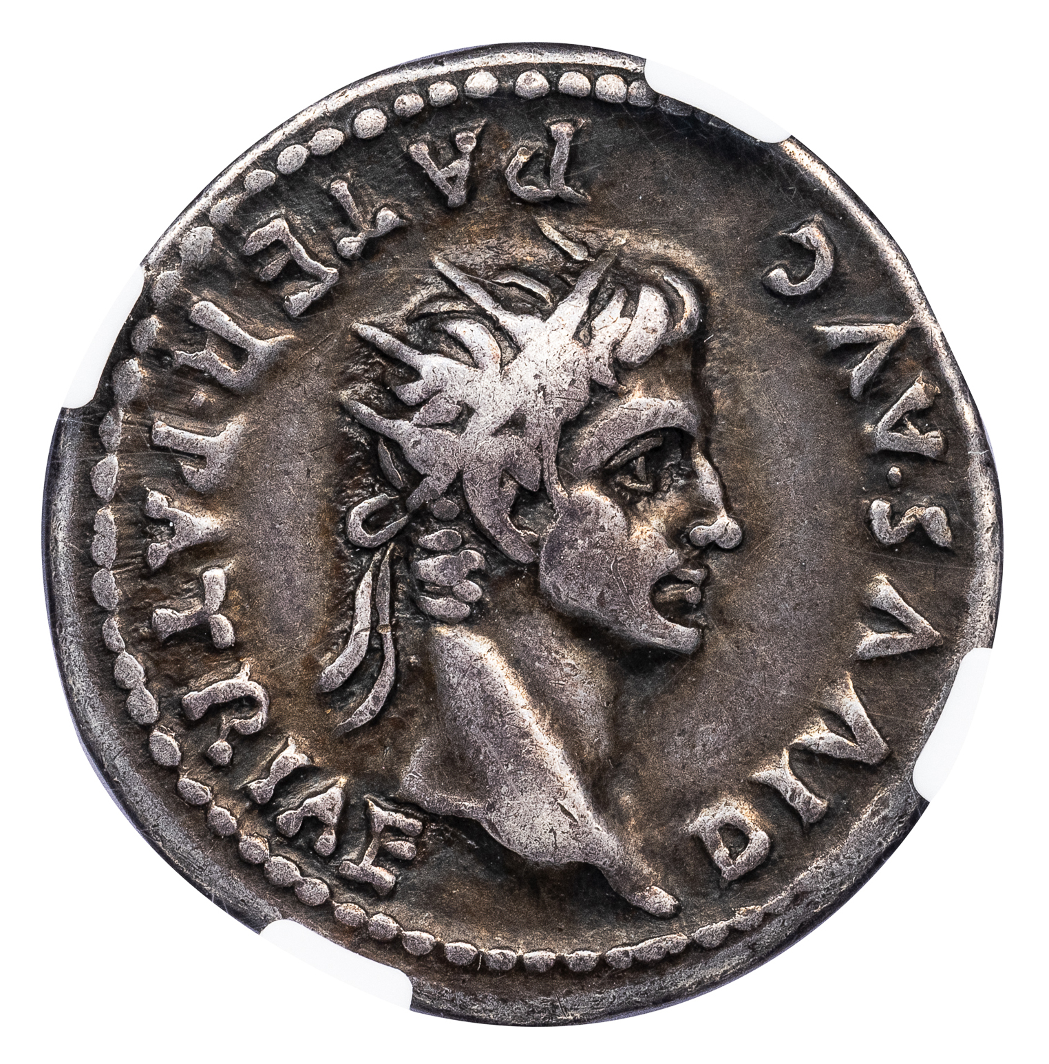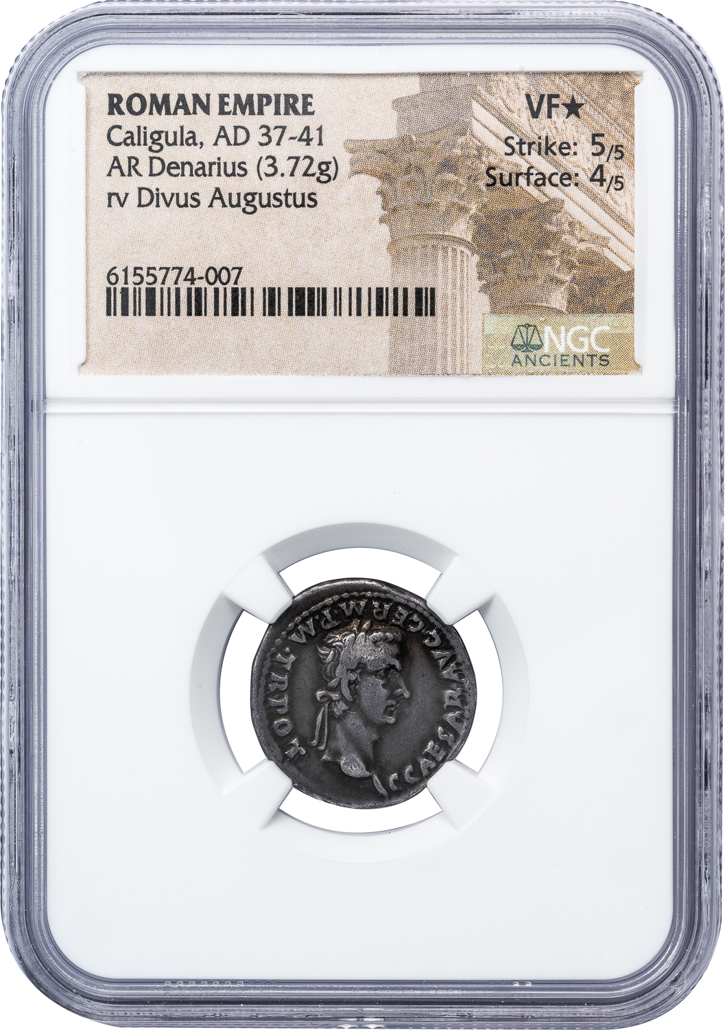 CALIGULA SILVER DENARIUS – DIVUS AUGUSTUS ISSUE – VF STAR NGC GRADED ROMAN IMPERIAL COIN OF THE 12 CAESARS (Inv. 20808)