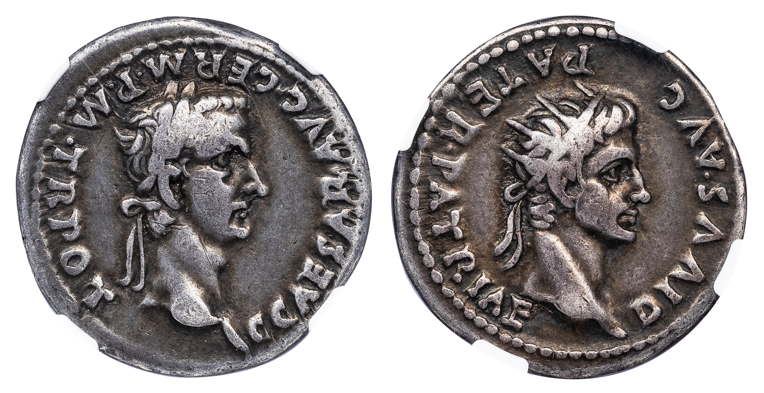 The prominent depiction of the deified Augustus on this denarius advertises Caligula’s attempts to present himself as a proper heir of the first emperor, his great-grandfather, following the debacle of Tiberius’ reign. He publicly burned Tiberius’ papers to signal an end to the terror of the treason trials, brought back the remains of his exiled mother and brothers for internment in their proper place in the Mausoleum of Augustus, and was widely described as a beloved ruler who seemed poised to usher in a new golden age. Unfortunately, in the same period that this coin was struck, Caligula fell seriously ill. When he recovered, something had changed. The emperor now embarked on a campaign of violence and outrage against the important classes of Roman society – the senate, the equestrian order, and the army – as he slipped into madness. He seriously considered granting senatorial status to his favorite horse, prepared his legions for an invasion of Britannia, only to have them gather seashells on the European shore of the English Channel, and began to consider himself a living god – a step above Augustus, who was only recognized officially as a god in Rome after his death. Finally, the emperor’s insanity became more than the Roman state could bear, and Caligula was murdered along with his wife and daughter in AD 41. With the sword blows of the Praetorian Guard, Caligula was sent to eternity, and the Julian branch of the Julio-Claudian dynasty was snuffed out on earth.