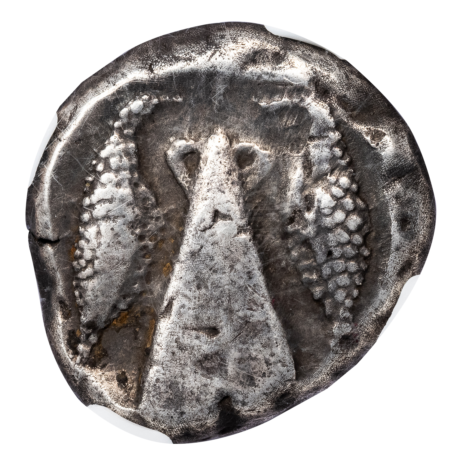 Obv Winged female figure in running-kneeling stance left, head turned to right, holding caduceus in her right hand and wreath in her left. Rev. Triangular baetyl with handles at top, granulated patterns in the shape of stylized birds to left and right, all within incuse square.