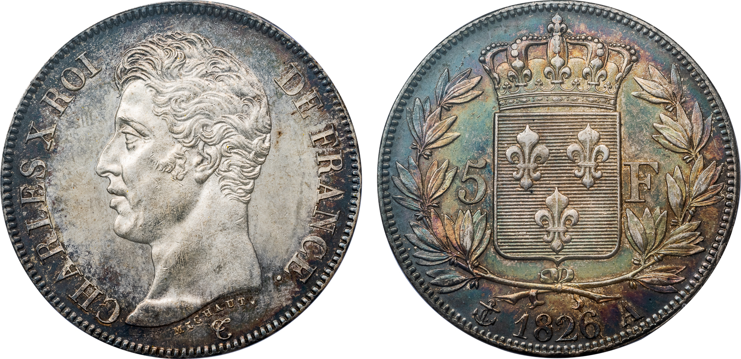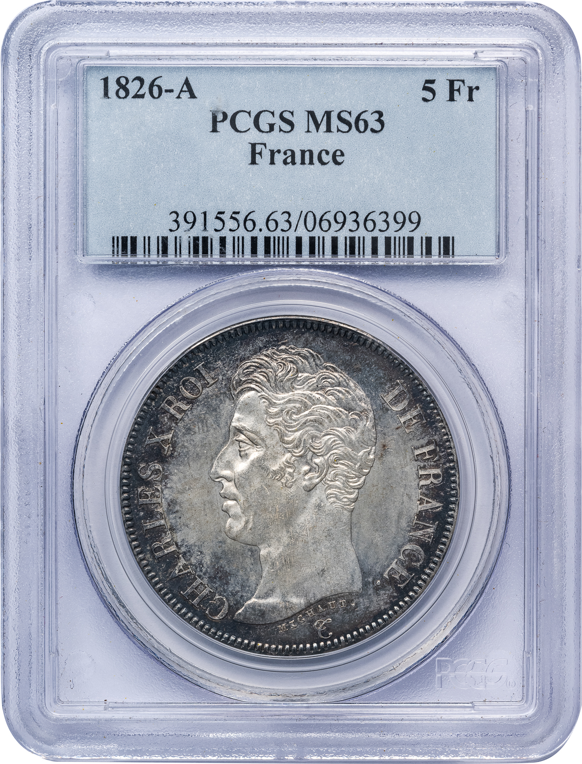 CHARLES X SILVER 5 FRANCS -1826A ISSUE – MS63 PCGS GRADED IRIDESCENT FRANCE WORLD COIN (Inv. 20774)