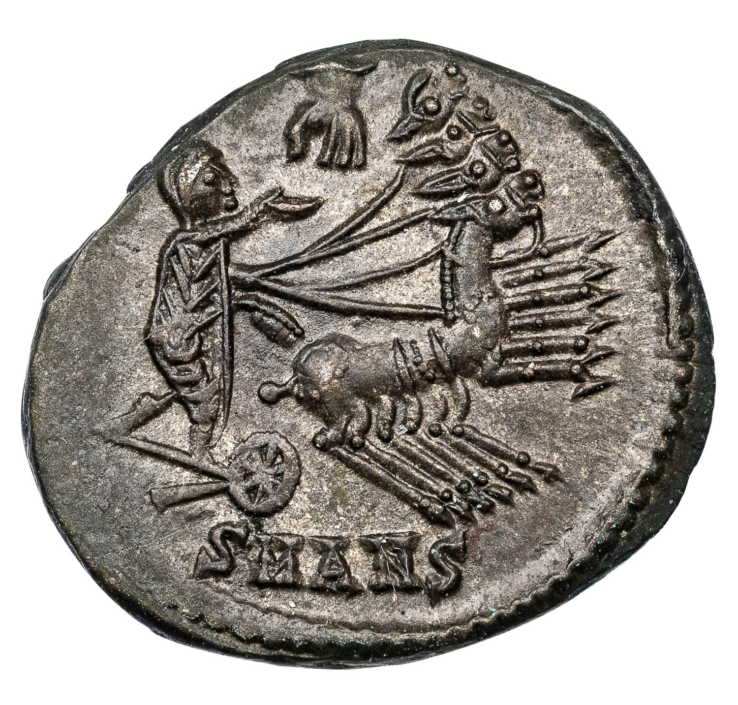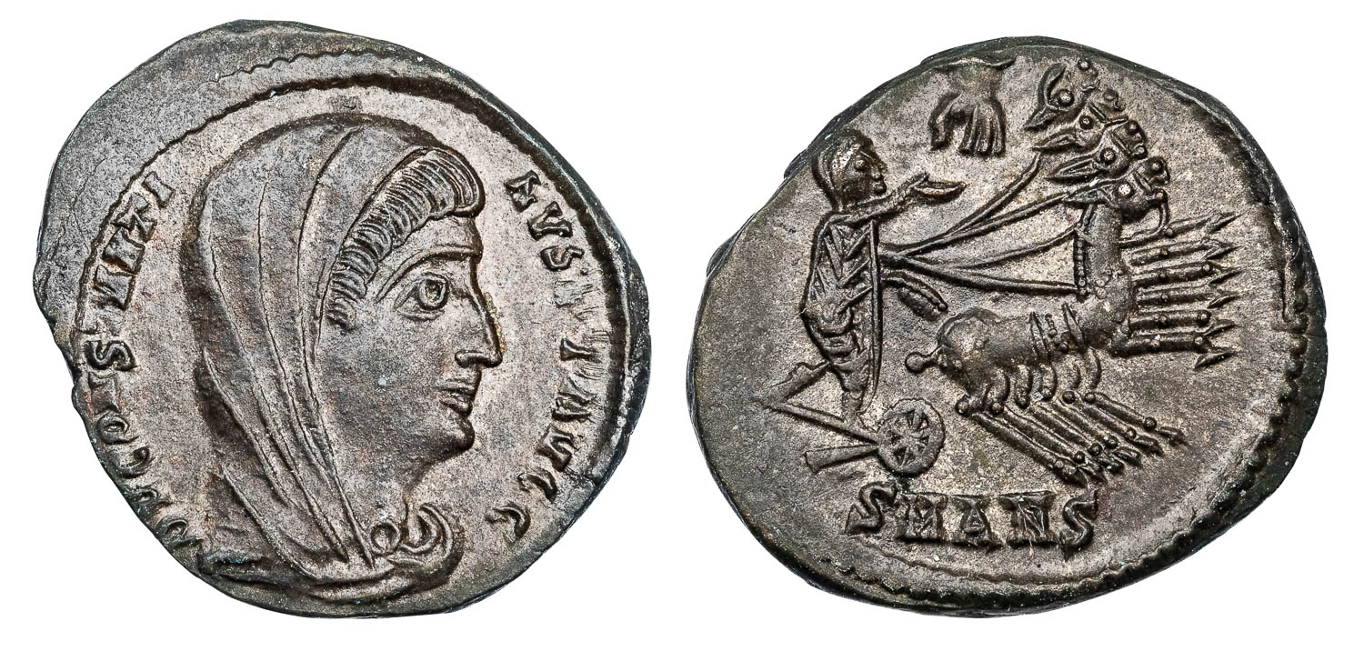 Obv. DV CONSTANTINVS PT AVGG, veiled head of Constantine the Great right. Rev. Constantine in quadriga right, extending his had up towards God, represented by the manus dei, SMANS in exergue.