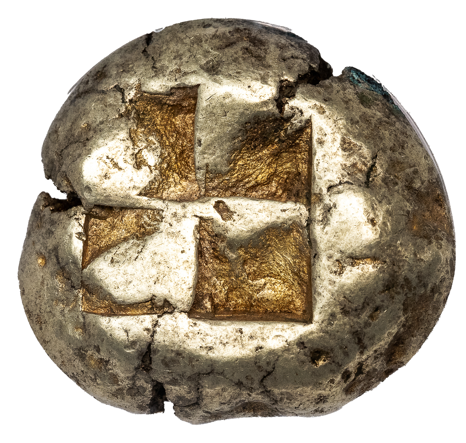 Obv. Siren or harpy standing left, holding tunny downward, floral tendrils in her hair. Rev. Quadripartite incuse square.