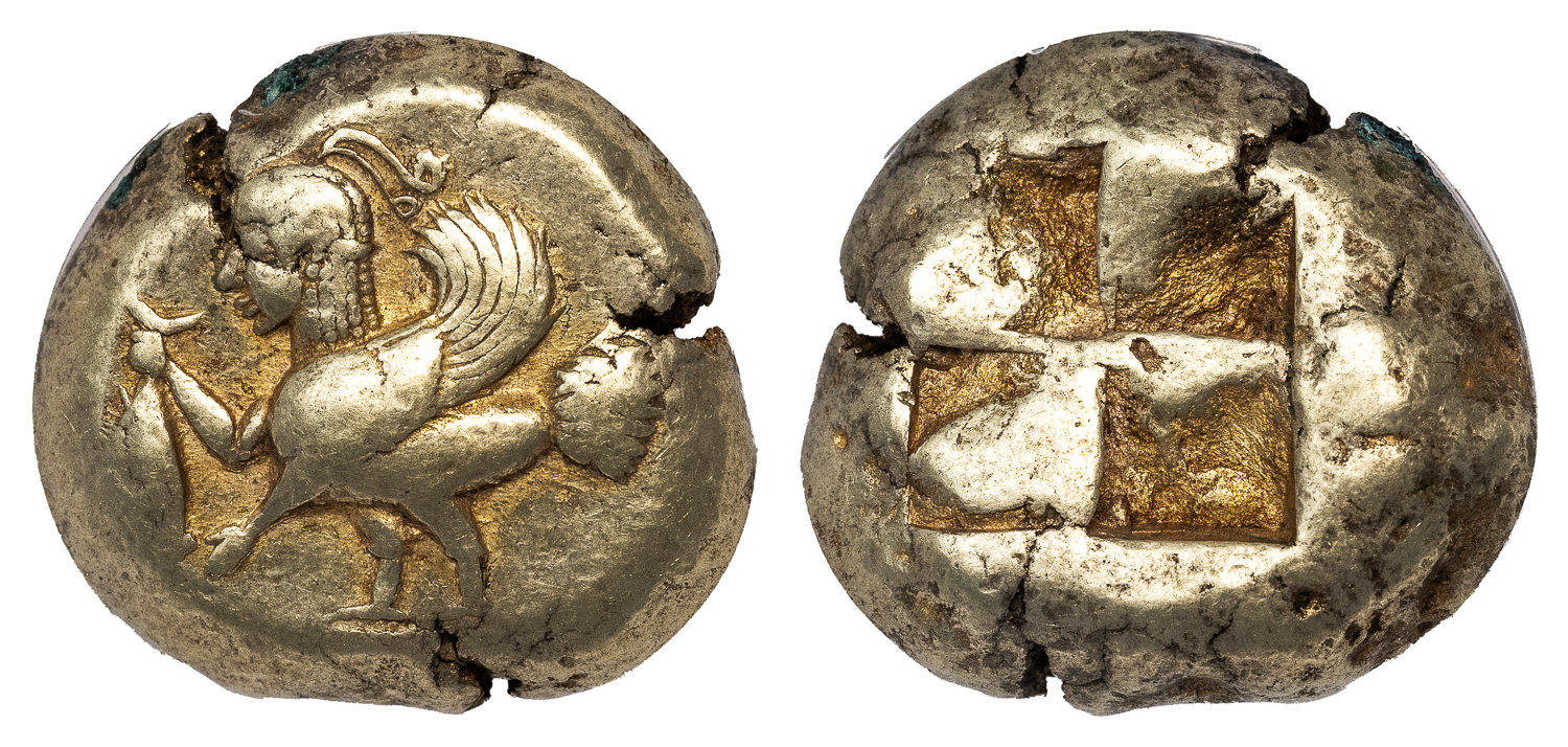 The mythical creature depicted on this rare Cyzicene stater has been variously described as a harpy or a siren, both of which were understood by the Greeks to be half-bird and half-woman. Harpies served the Erinyes (Greek goddesses of vengeance) by tormenting evildoers with their shrill cries, the stench of their droppings, and by stealing their food. Jason and the Argonauts saved the blind seer Phineas from punishment by the harpies. In contrast, the sirens were the offspring of the river-god Alpheus who sang beautiful, hypnotic songs to lure sailors to their deaths on sharp rocks. Odysseus famously prevented the loss of his ship and crew to the sirens’ song by advising his men to stuff their ears with beeswax and to tie him to the mast.
