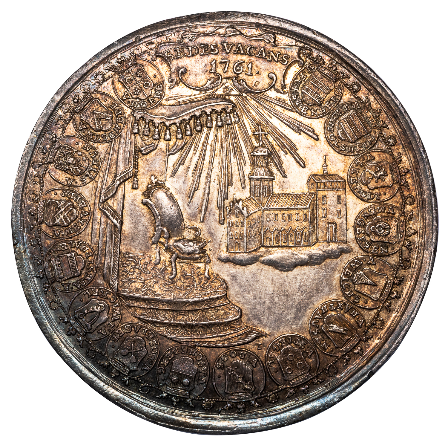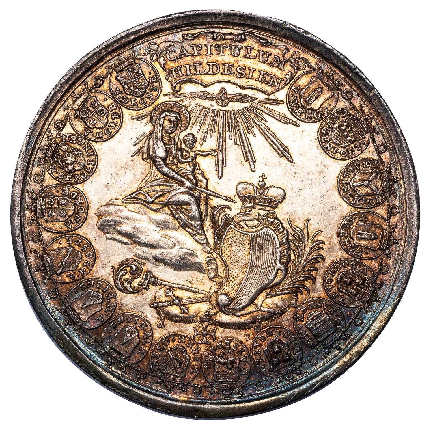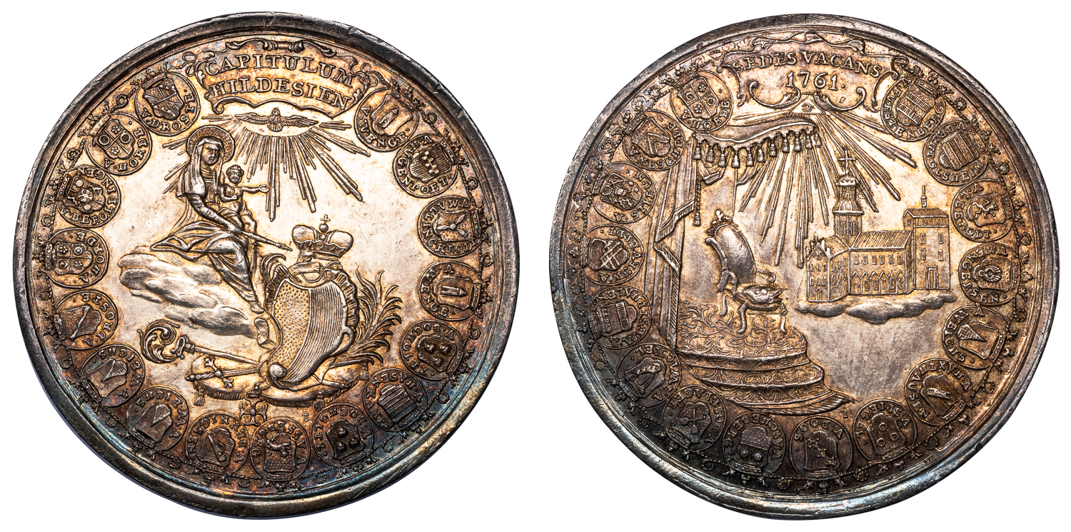 Obv. Madonna enthroned on clouds, holding the infant Christ and scepter, coat-of-arms on pillow below, border of 16 crowned coats-of-arms around, and cartouche inscribed CAPITULUM/HILDESIEN. Rev. Empty Cathedra (bishop’s chair) and cathedral at right, border of 16 crowned coats-of-arms around, and cartouche inscribed SEDES VACANS/1761.