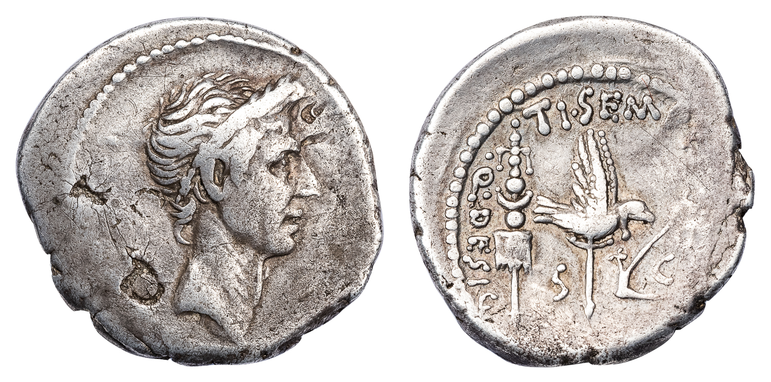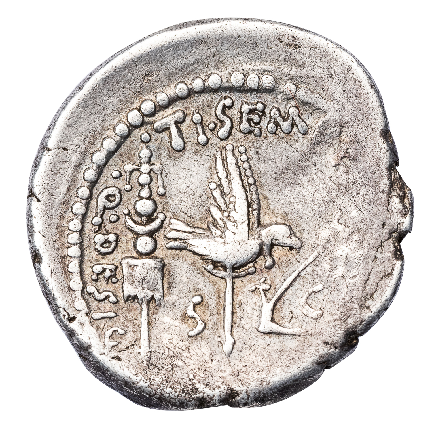 Obv. Laureate head of Caesar right. Rev. TI SEM[PRONIVS GRACCVS] Q DESIG, signum, aquila, aratrum, and decempeda, S-C in field.