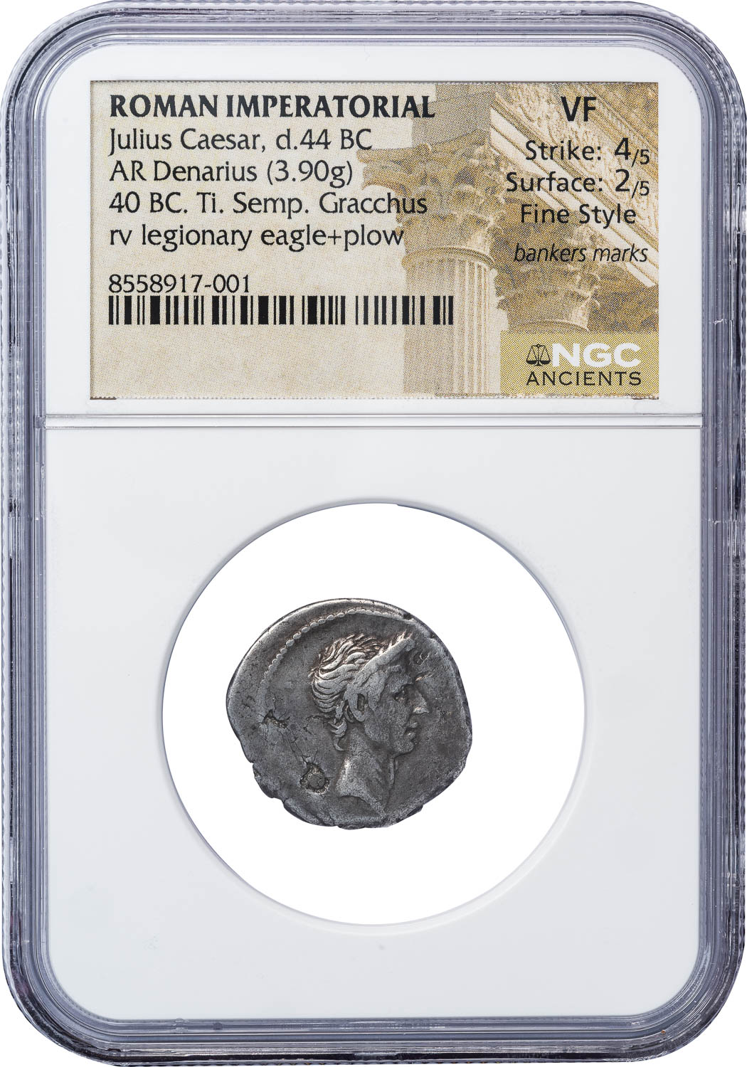 JULIUS CAESAR SILVER DENARIUS – POSTHUMOUS PORTRAIT ISSUE OF SEMPRONIUS GRACCHUS – VF FINE STYLE NGC GRADED ROMAN IMPERATORIAL COIN OF THE 12 CAESARS (Inv. 20824)
