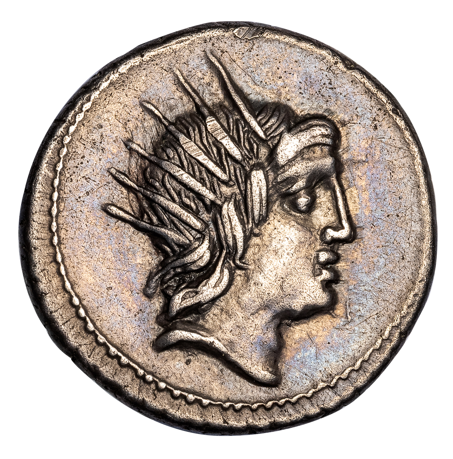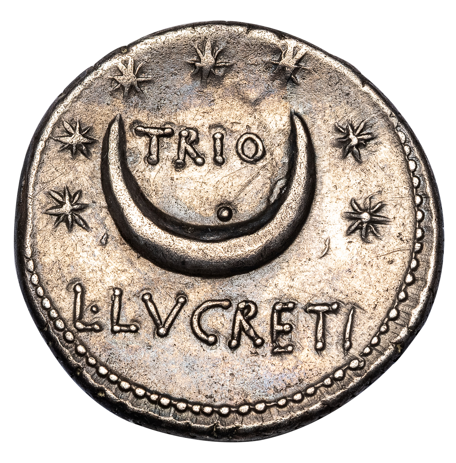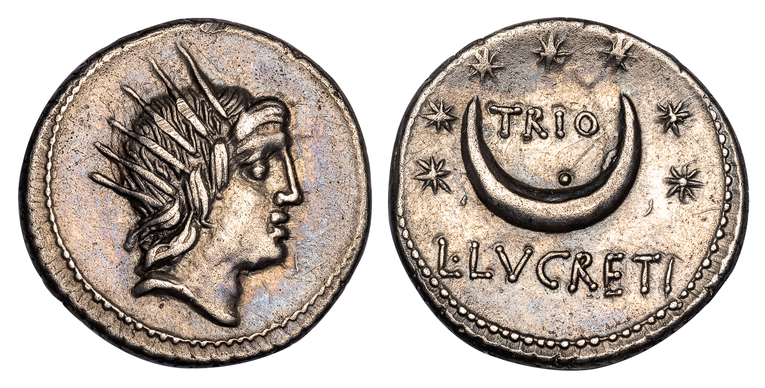Obv. Radiate head of Sol right. Rev. L•LVCRETI TRIO, crescent and seven stars.