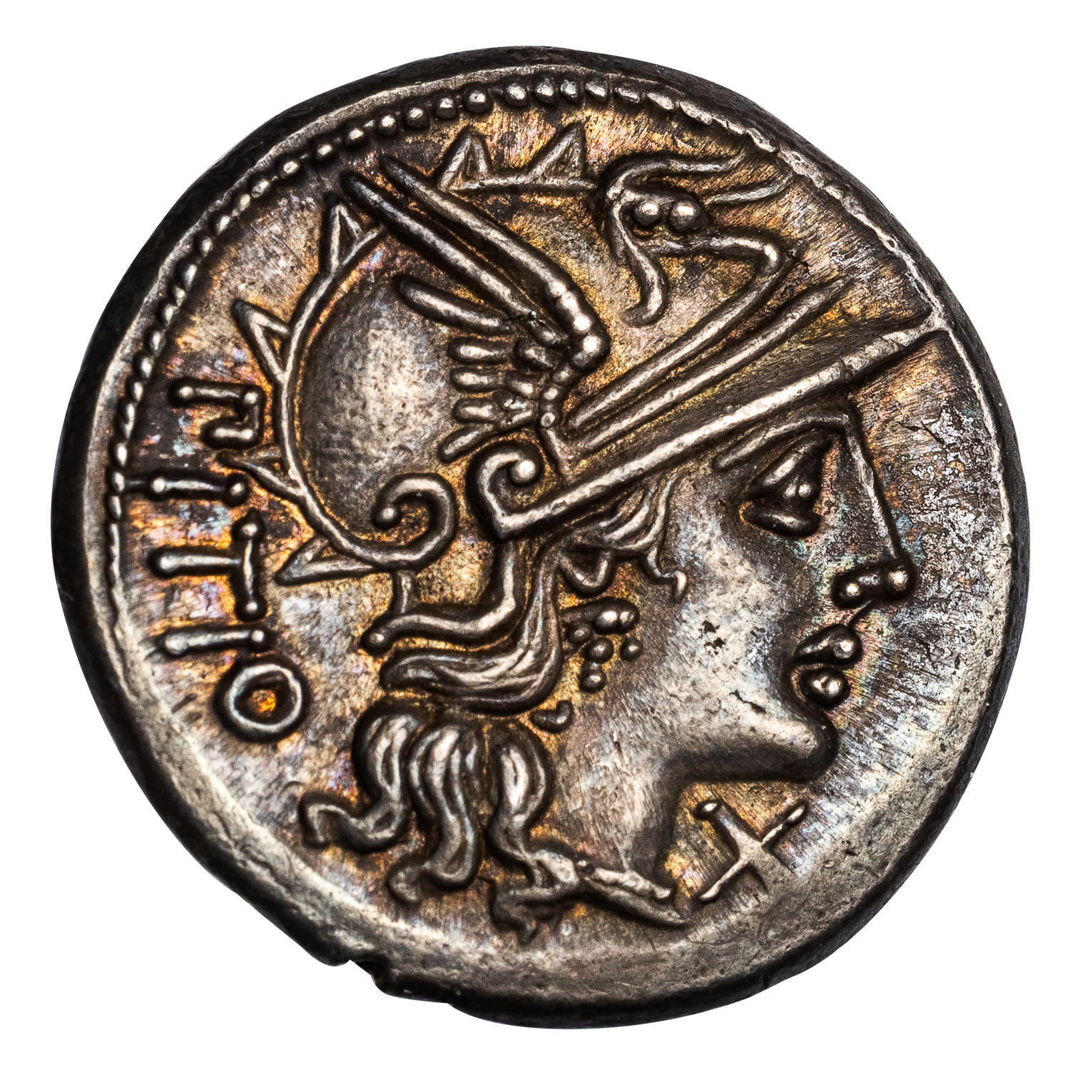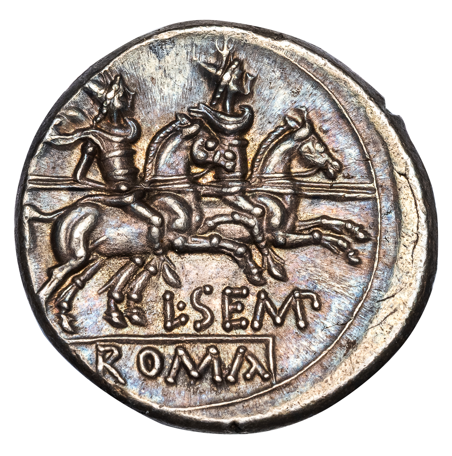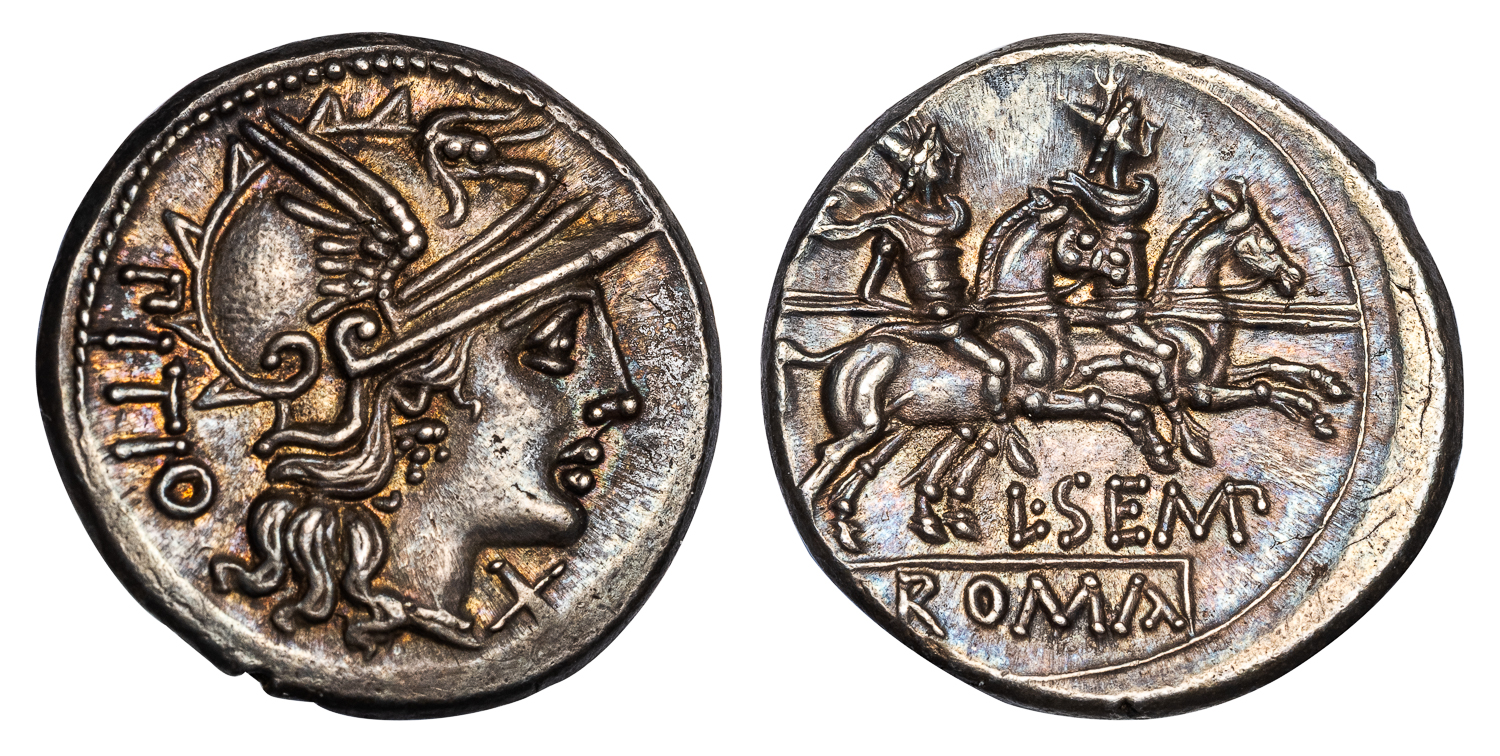 Obv. PITIO, helmeted head of Roma right, X (mark of value) in lower right field. Rev. L SEMP, Dioscuri riding right, ROMA in exergue.