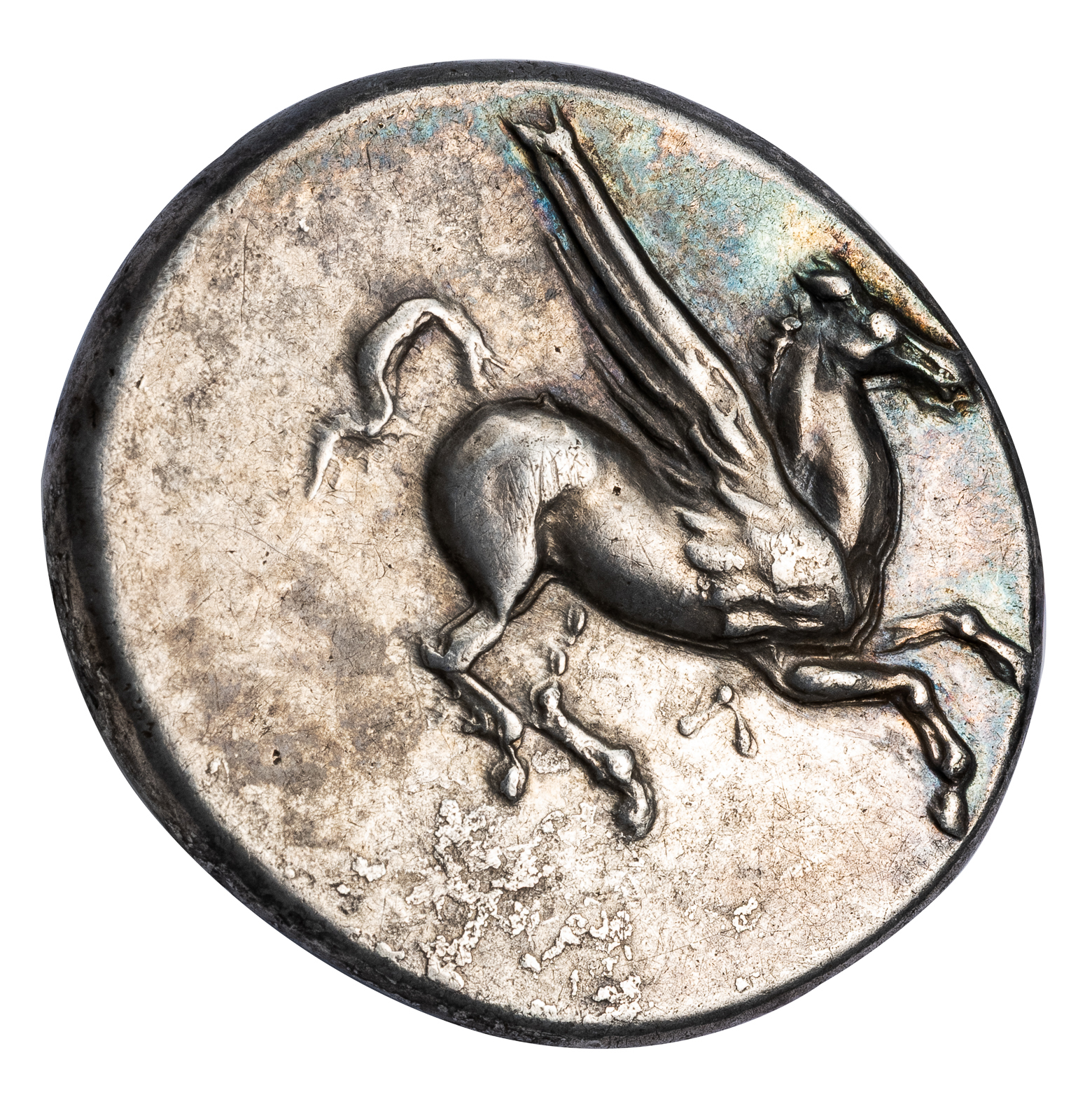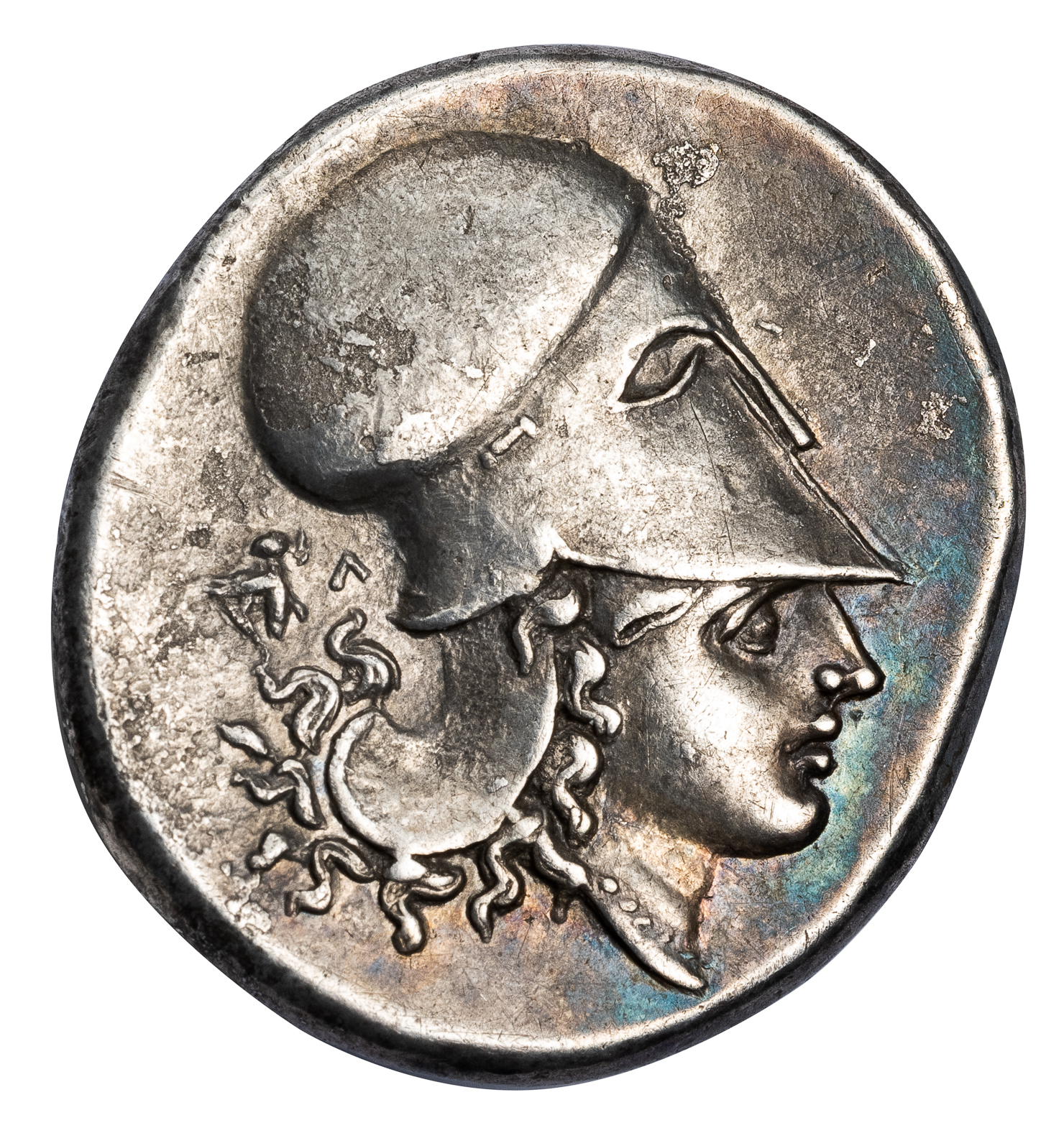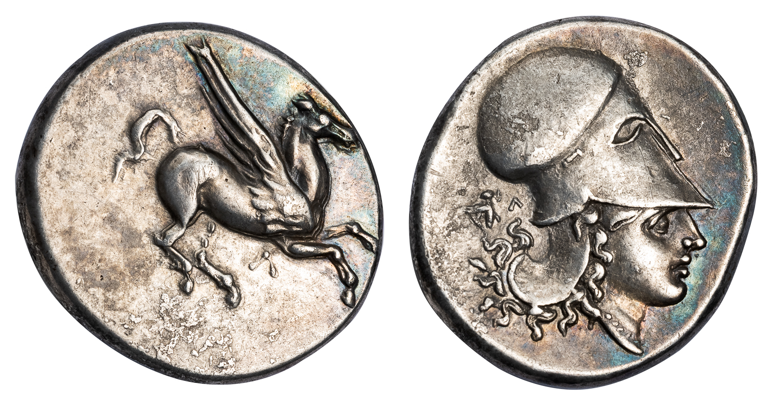 Obv. Pegasus flying right, Λ below. Rev. Head of Athena right, wearing Corinthian helmet, grasshopper and Λ in left field.