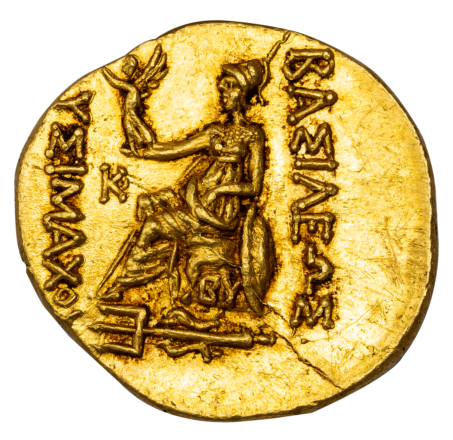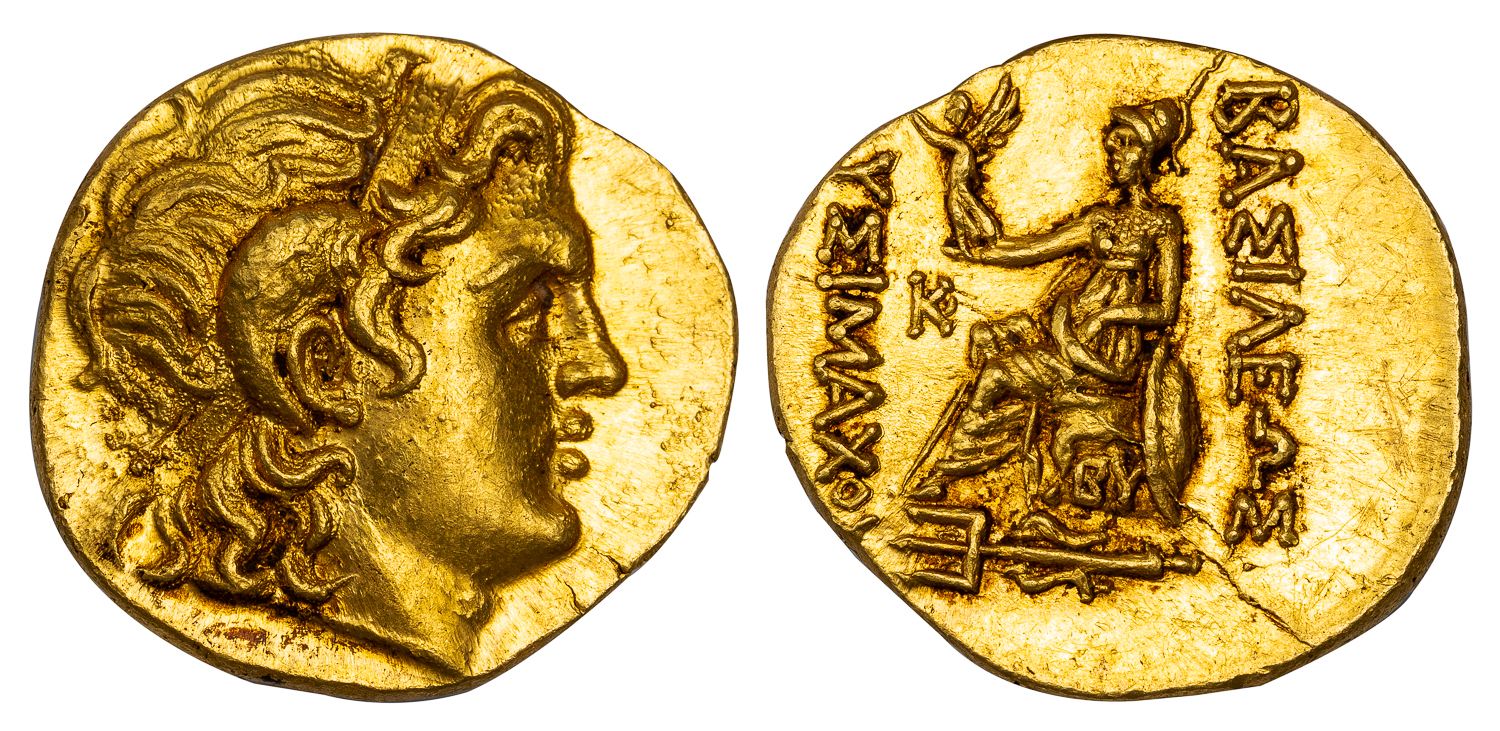 Obv. Head of deified Alexander the Great right, with the horn of Ammon. Rev. ΒΑΣΙΛΕΩΣ ΛΥΣΙΜΑΧΟΥ, Athena enthroned left, holding Nike crowning Lysimachus’ name, KAΛ control monogram in left field, BY on throne, ornate trident left in exergue.
