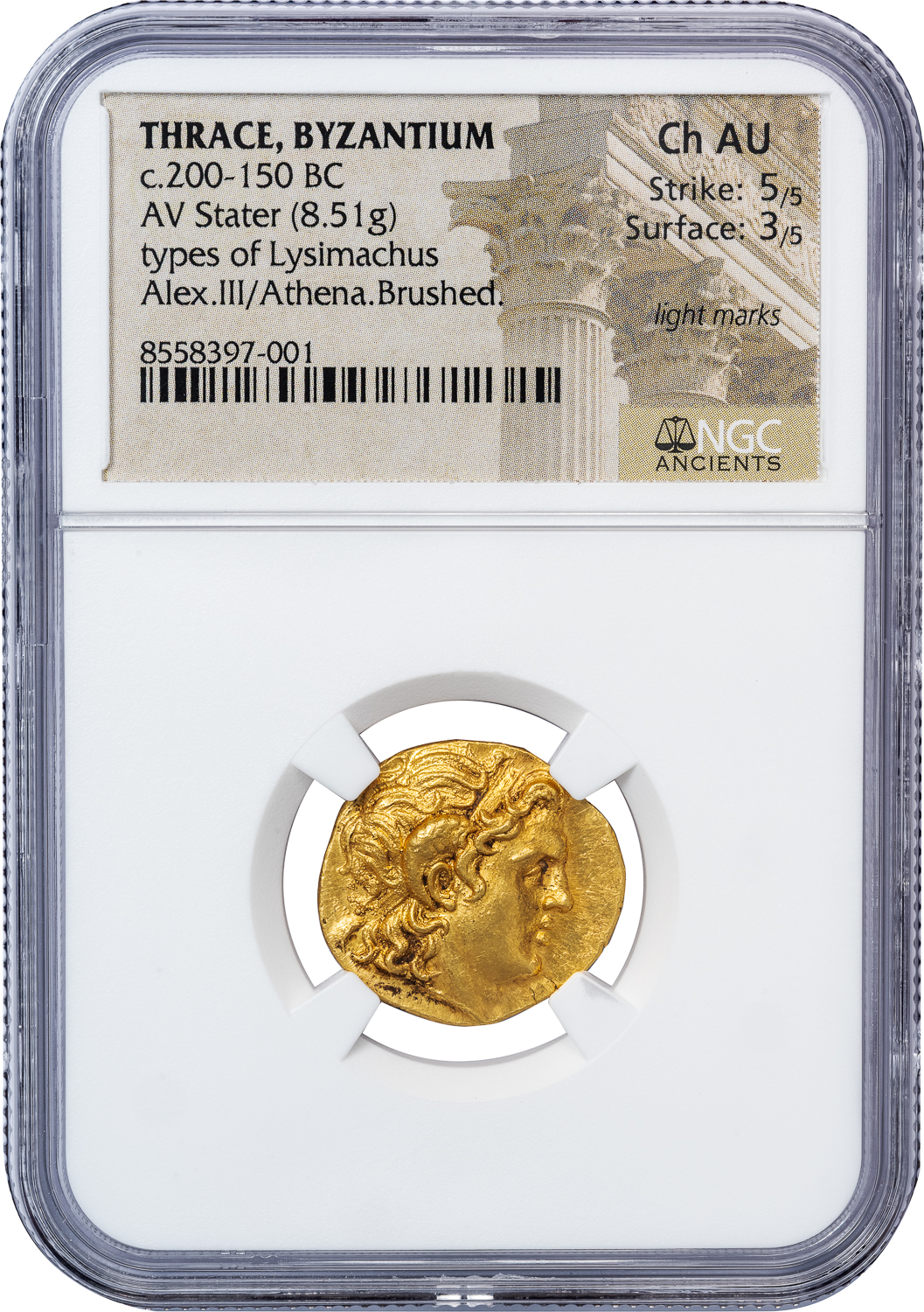 LYSIMACHUS GOLD STATER FROM BYZANTIUM – RARE 180s ISSUE – CHOICE AU NGC GRADED GREEK THRACE COIN (Inv. 20599)