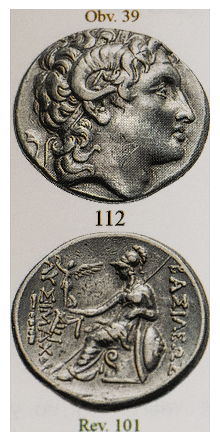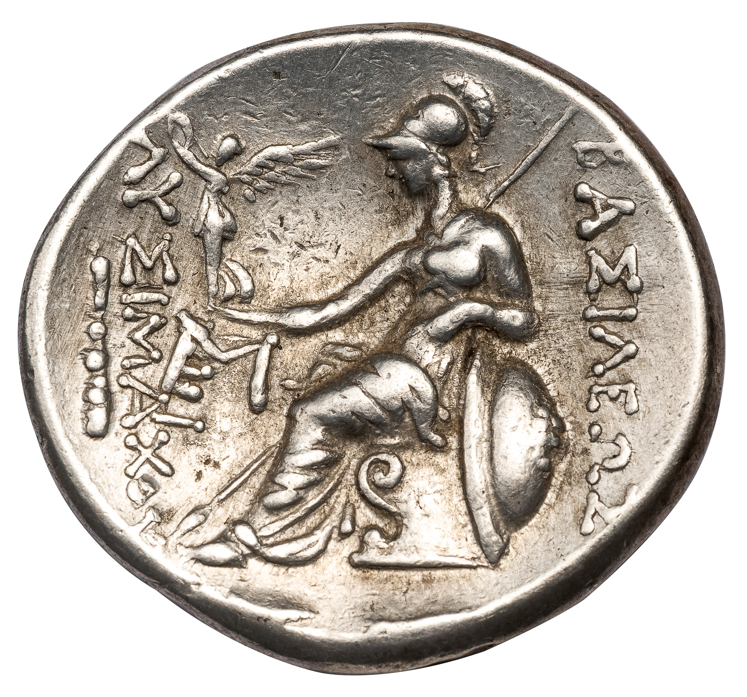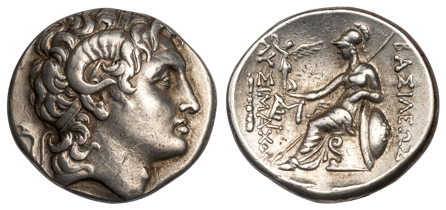 Obv. Head of deified Alexander the Great right, with the horn of Ammon. Rev. ΒΑΣΙΛΕΩΣ ΛΥΣΙΜΑXΟΥ, Athena enthroned left, holding Nike crowning Lysimachus’ name, club in outer left field, EYM monogram in left field, bow case and ΣΩ ? monogram in exergue.