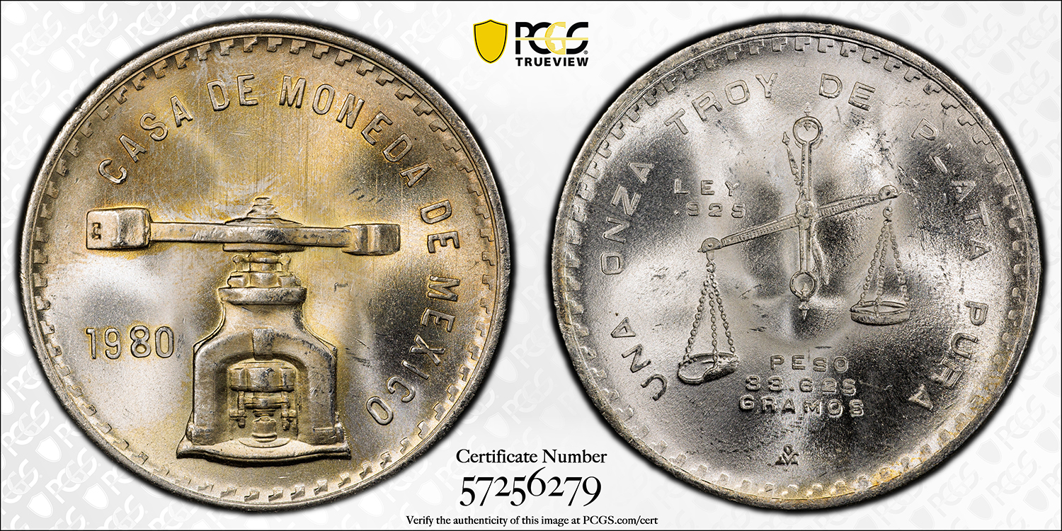 MEXICO SILVER ONZA – 1980/9-Mo CASA DE MONEDA ISSUE – MS66 PCGS WORLD COIN (Inv. 20731)