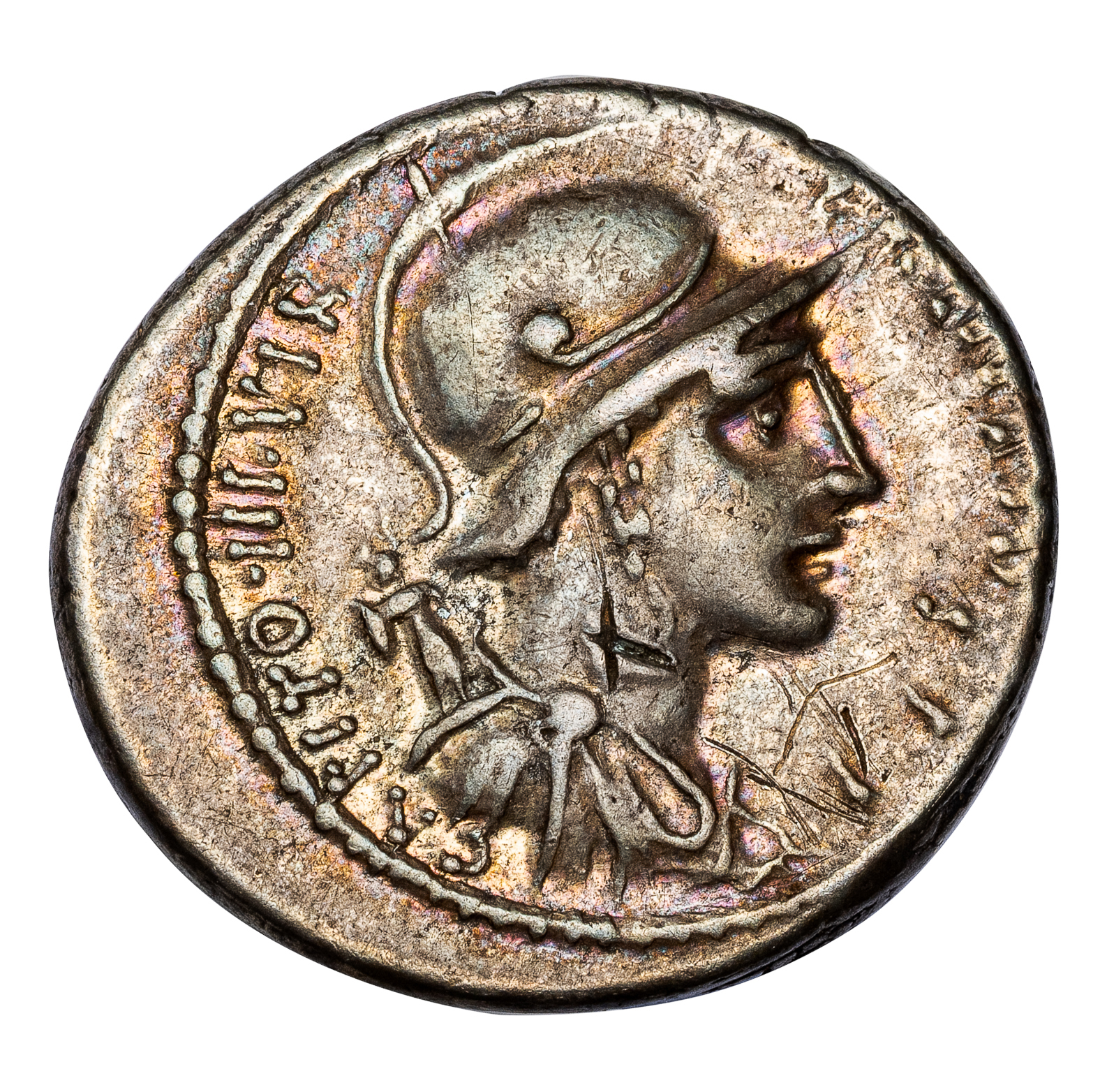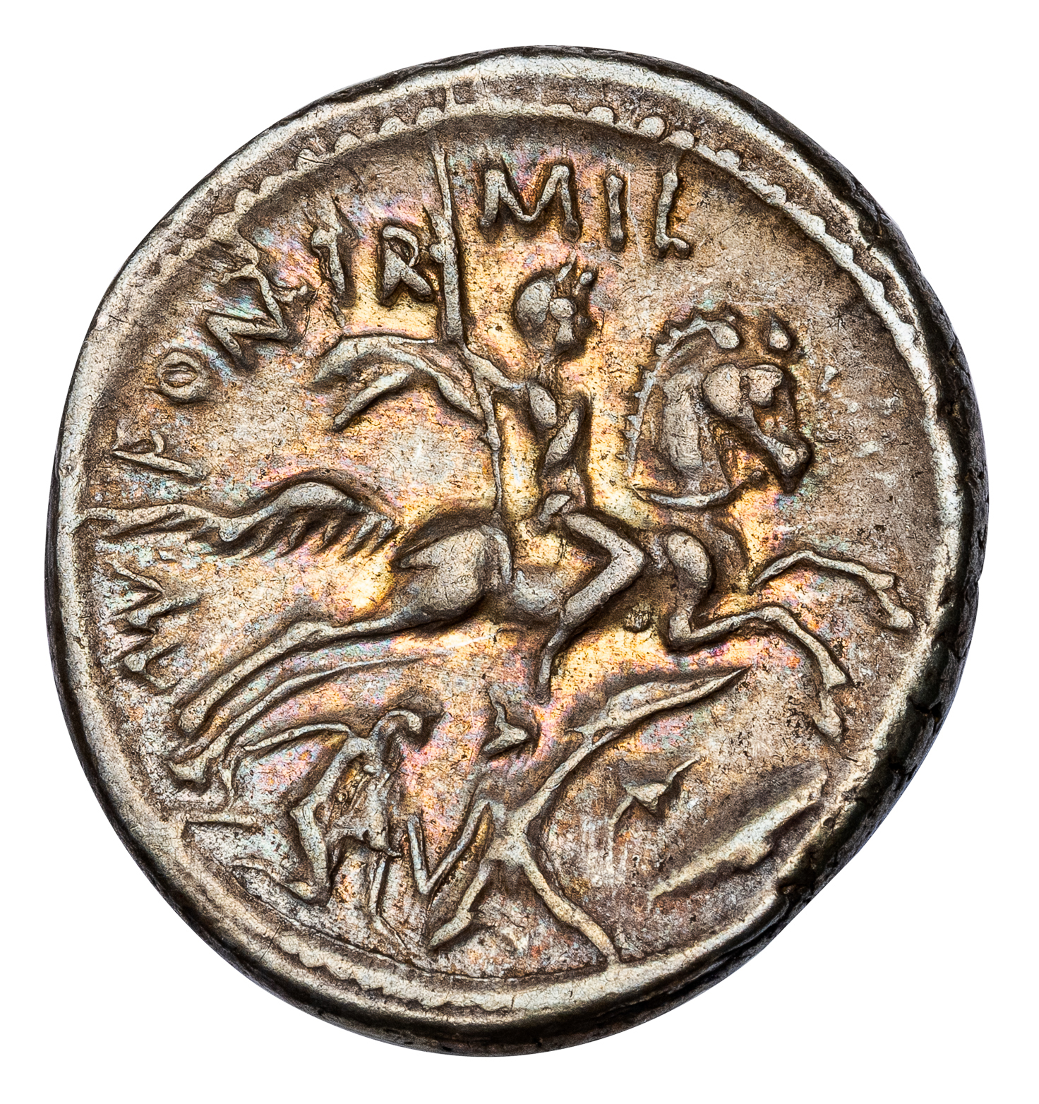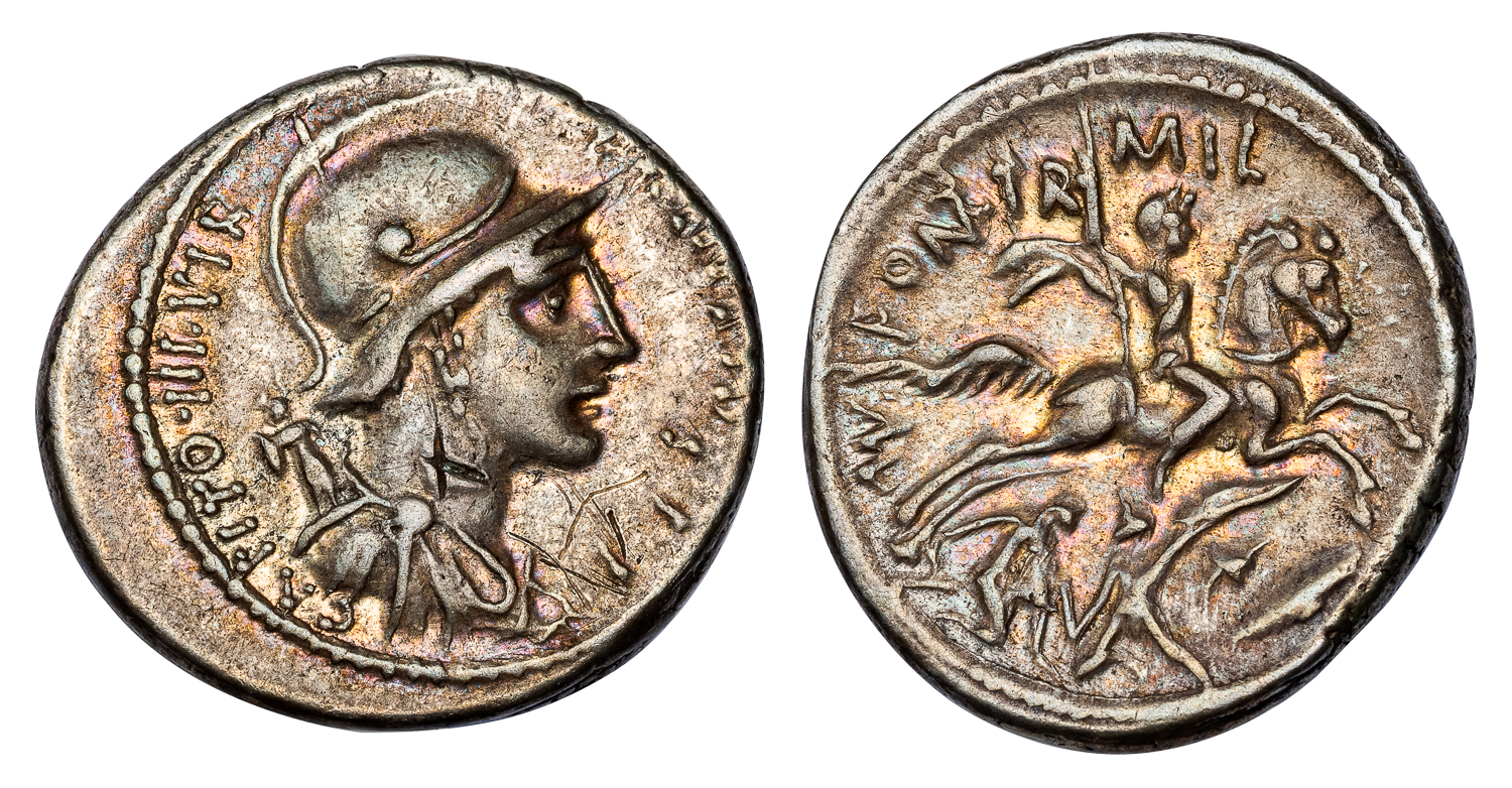 Obv. P FONTEIVS P F CAPITO III VIR, helmeted and draped bust of Mars right, trophy behind shoulder. Rev. MN FONT TR MIL, warrior on horseback, spearing two fallen Gauls below.