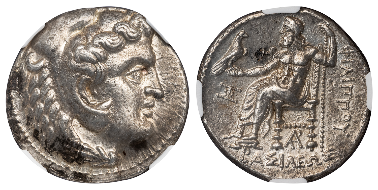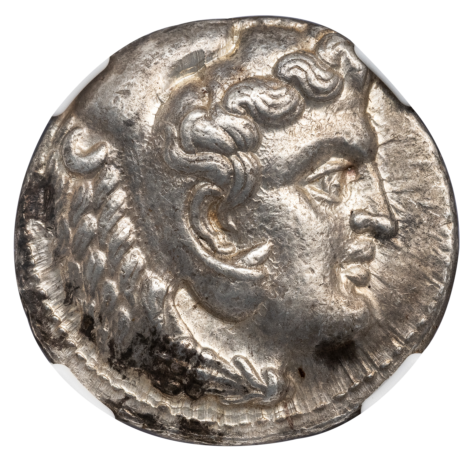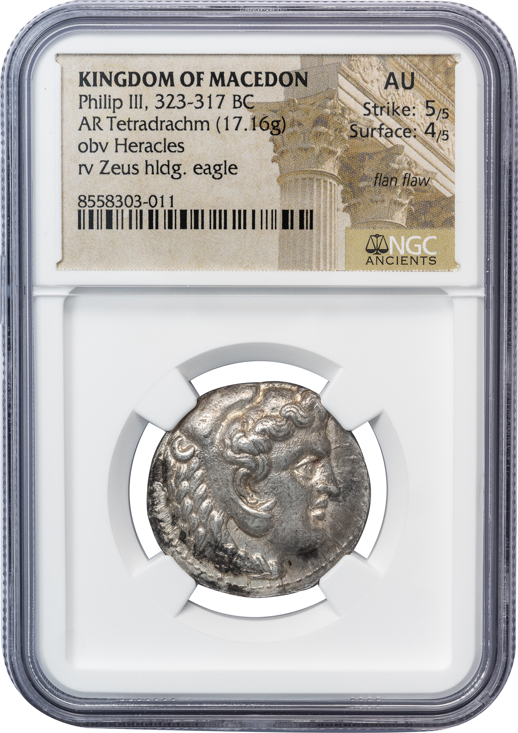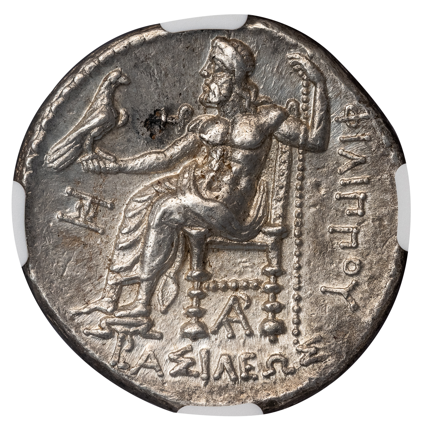 PHILIP III ALEXANDER TYPE SILVER TETRADRACM – ISSUE OF “UNCERTAIN MINT 6A” – AU NGC GRADED KINGDOM OF MACEDON COIN (Inv. 20596)