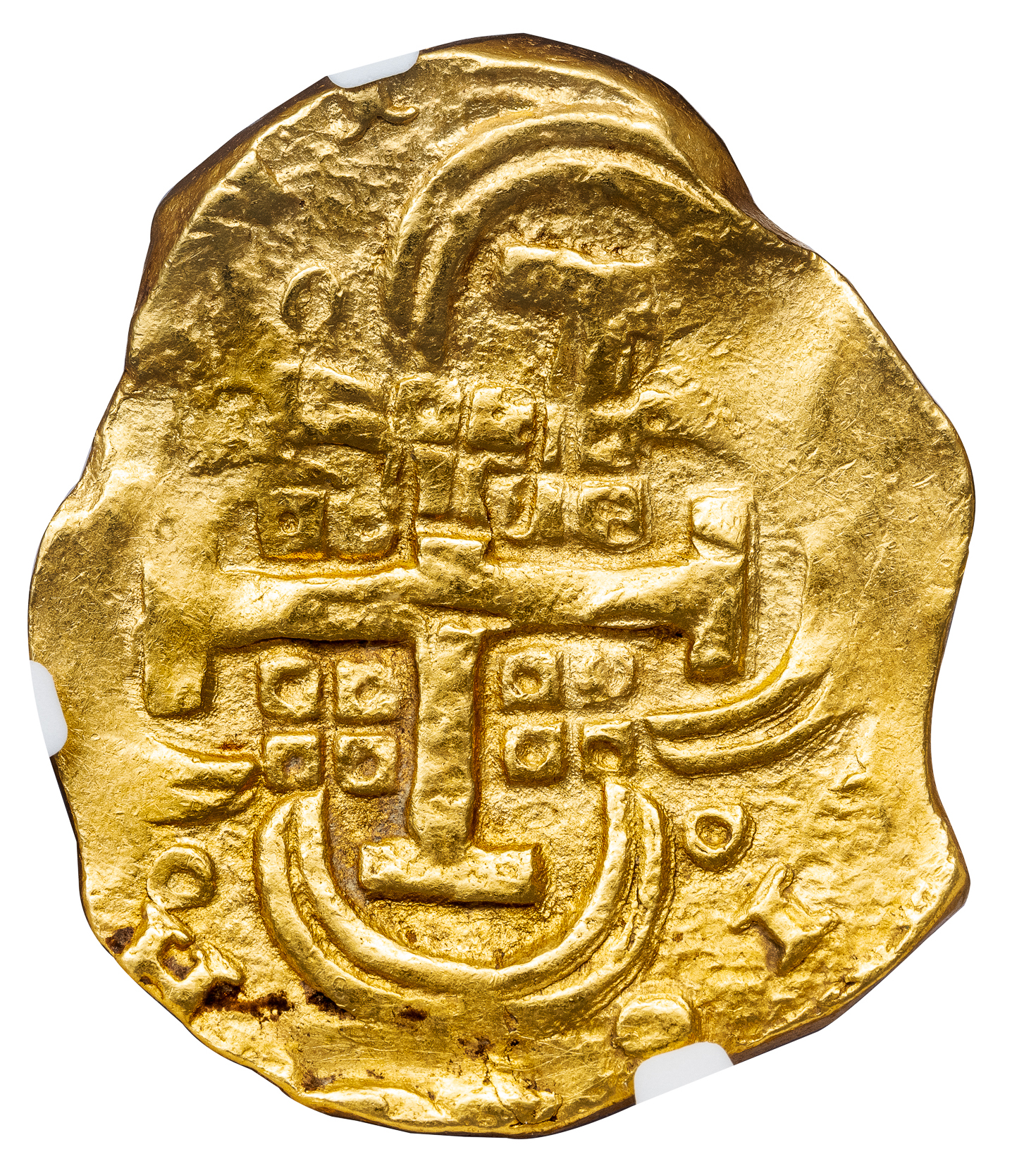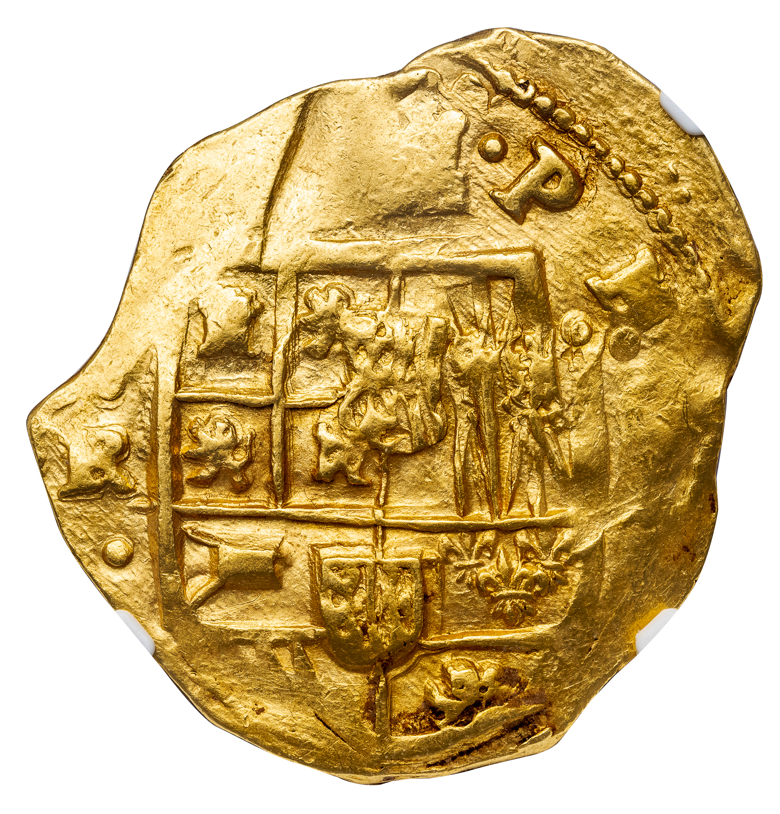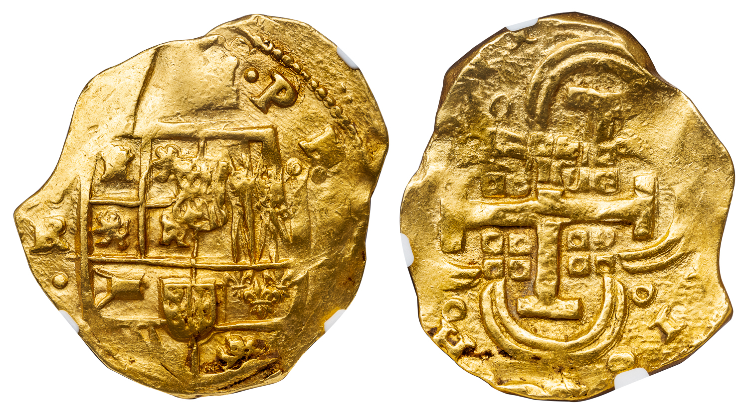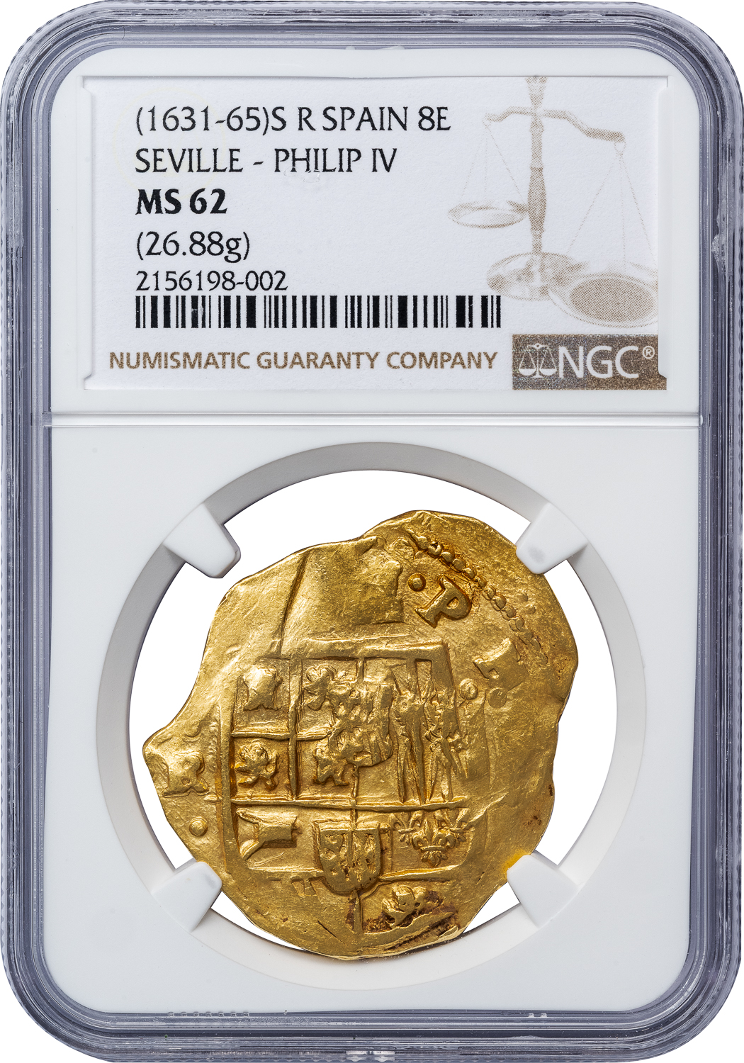 PHILIP IV GOLD 8 COB ESCUDOS -INTERESTING DIE SHIFT ERROR OF ASSAYER R ISSUE OF SEVILLE – MS 62 NGC GRADED SPAIN WORLD COIN (Inv. 20766)