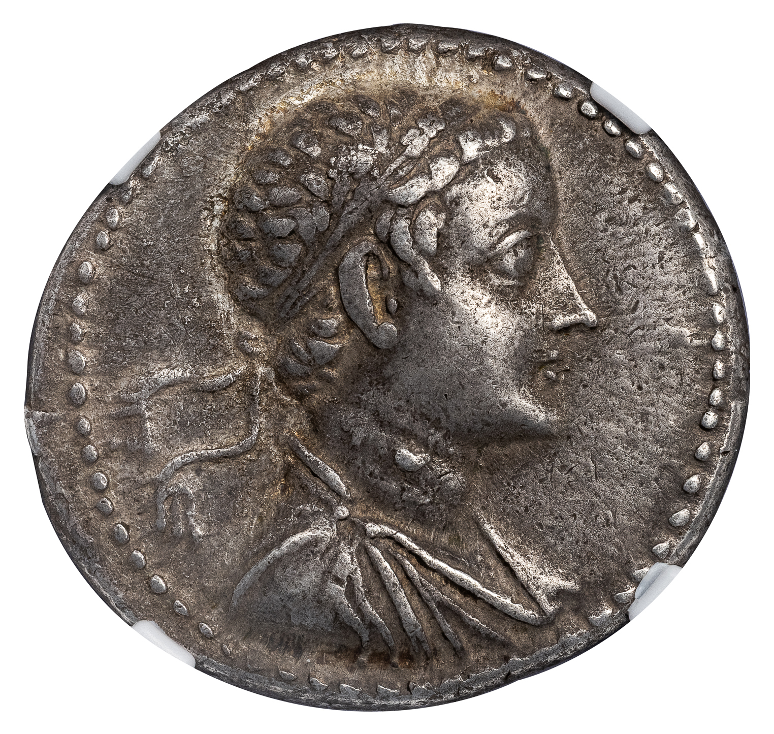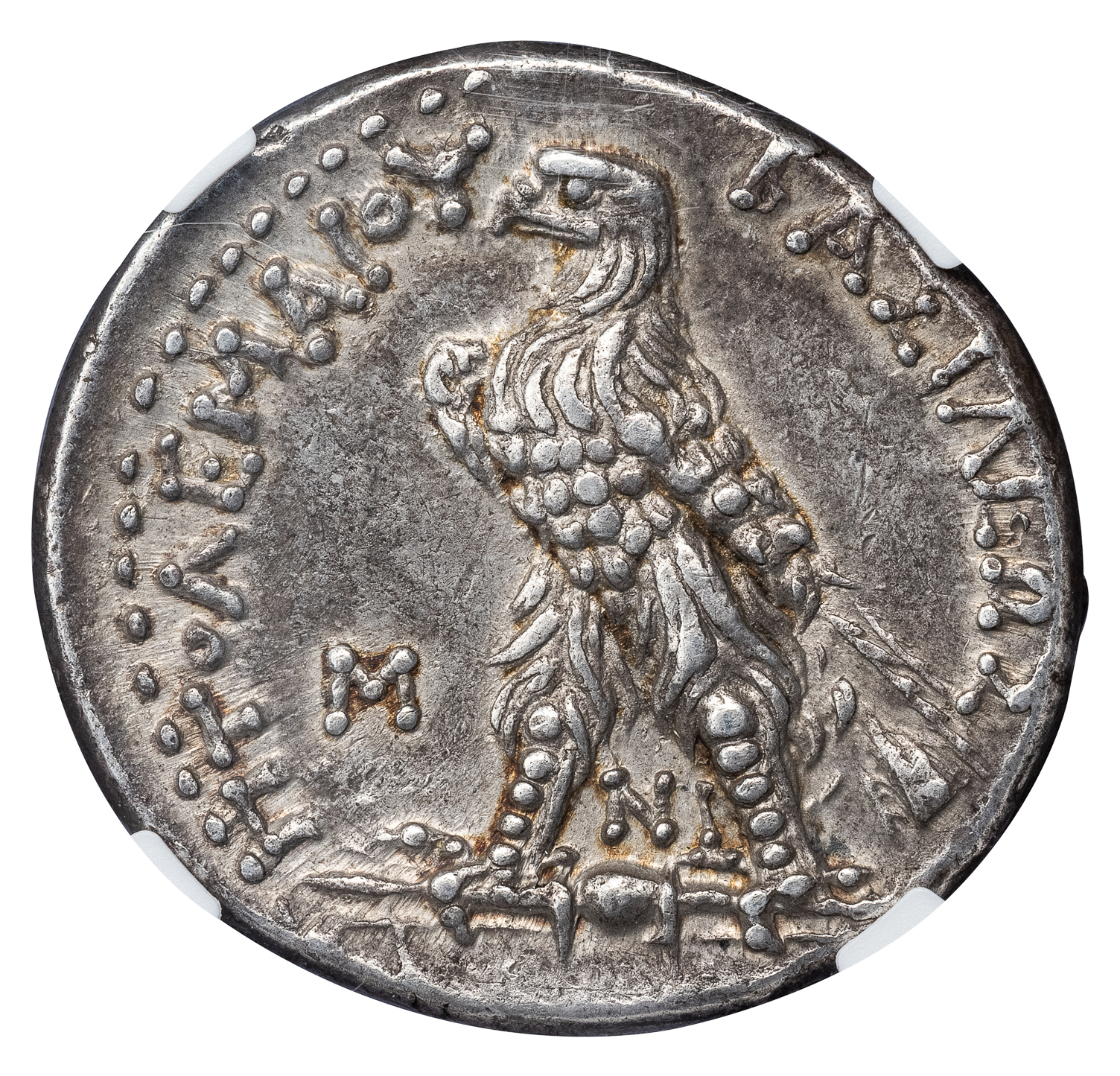 This coin belongs to a series struck to finance the defense of Ptolemaic-controlled Phoenicia against the incursions of the Seleucid king Antiochus III during the Fifth Syrian War (202-195 BC). The young Ptolemy V is depicted wearing a Macedonian chlamys to illustrate his command of the army, while the grain ear on his diadem, a highly unusual feature, is thought to identify him with the god Triptolemos, whose Egyptian counterpart, Harpokrates, grew up to become Horus, the savior king of Egypt. Unfortunately, despite the inspirational character of the portrait, the coinage of Ptolemy V was not enough to save Phoenicia. By 195 BC the region had completely fallen to the forces of Antiochos III and was destined never to return to the Ptolemaic kingdom.