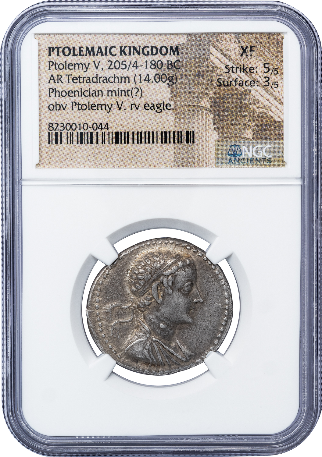 PTOLEMY V SILVER TETRADRACHM – ISSUE OF UNCERTAIN PHOENICIAN MINT – XF NGC GRADED GREEK PTOLEMAIC KINGDOM COIN (Inv. 20839)