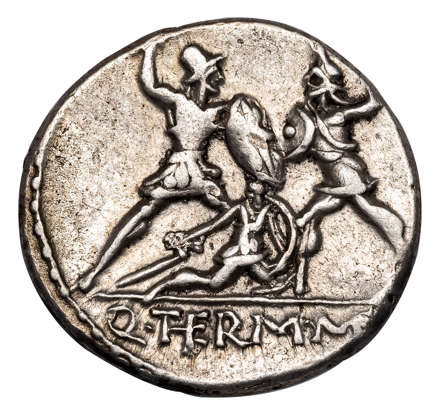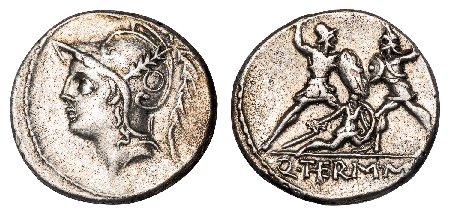 Obv. Helmeted head of Mars left. Rev. Roman soldier fighting Celtic soldier, fallen Roman between them, Q THERM MF in exergue.