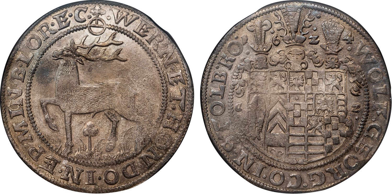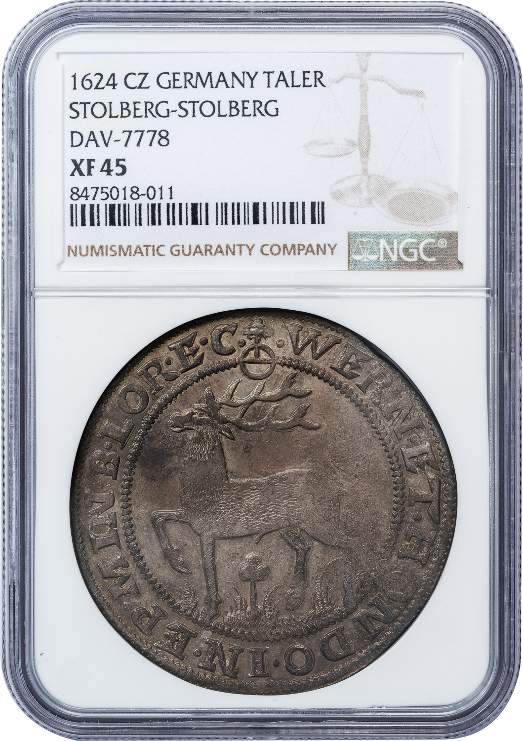 STOLBERG-STOLBERG WOLFGANG GEORGE SILVER TALER – 1624 CZ ISSUE WITH STAG – XF45 NGC GERMANY COIN (Inv. 20775)