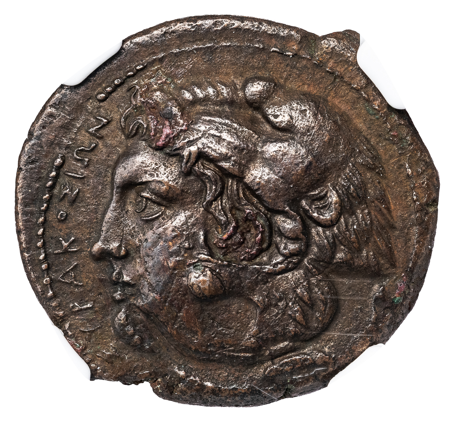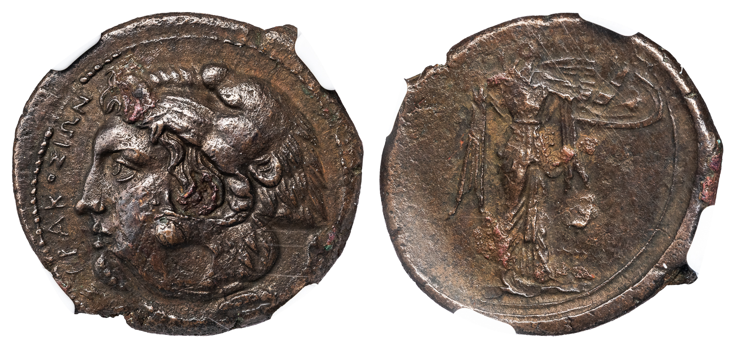 Obv. ΣYPAKOΣIΩN, head of youthful Heracles left, wearing lionskin headdress. Rev. Athena Promachus standing right, brandishing spear in her right hand and holding shield with her left.