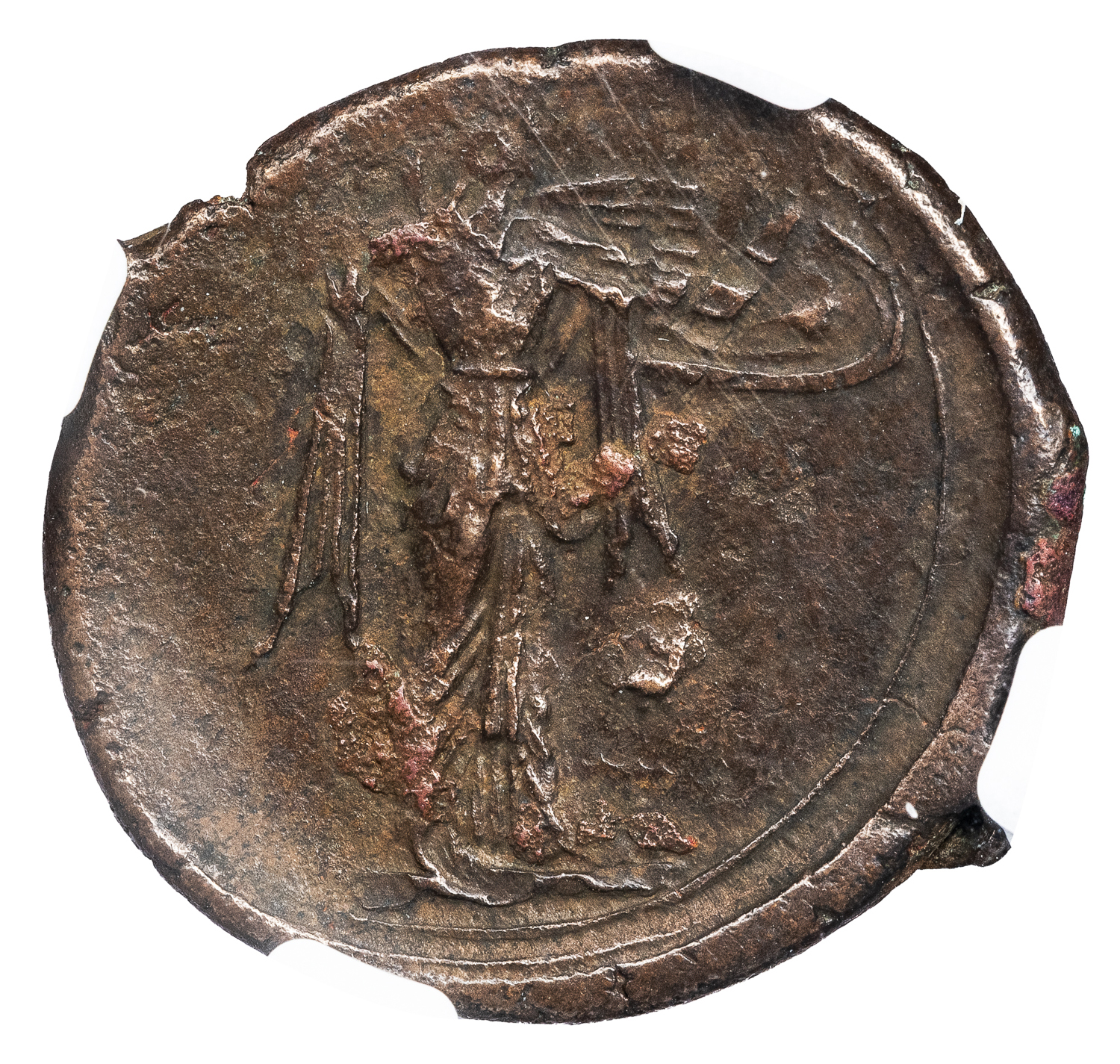 This fascinating bronze is clearly overstruck over an earlier coin, perhaps a Syracusan bronze of Agathocles with a helmeted head of Athena on the obverse (cf. SNG ANS 697-699). The bowl of the helmet and part of the dotted border appear upside down at six o’clock, below Hercules’ neck truncation. While overstrikes of bronzes are seen under the rule of Hicetas (287-278 BC), this seems to be the only readily documented example of such an overstrike under Pyrrhus.