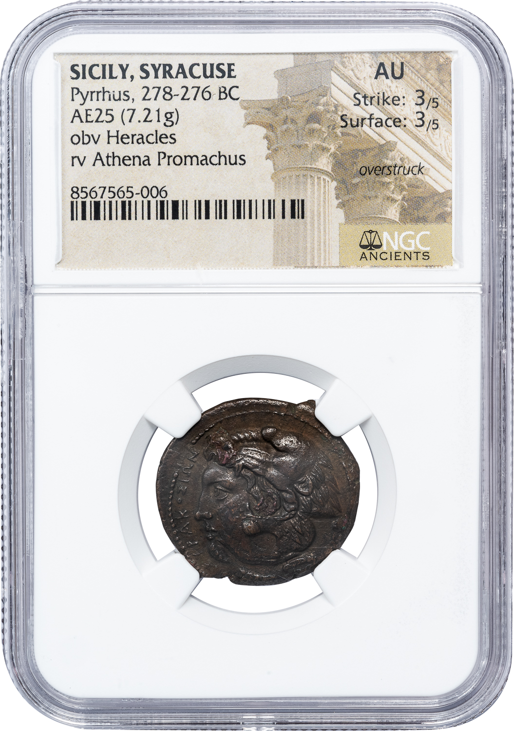 SYRACUSE BRONZE AE25 – OVERSTRIKE OF PYRRHUS ABOVE AGATHOCLES – AU NGC GRADED GREEK SICILY COIN (Inv. 20565)