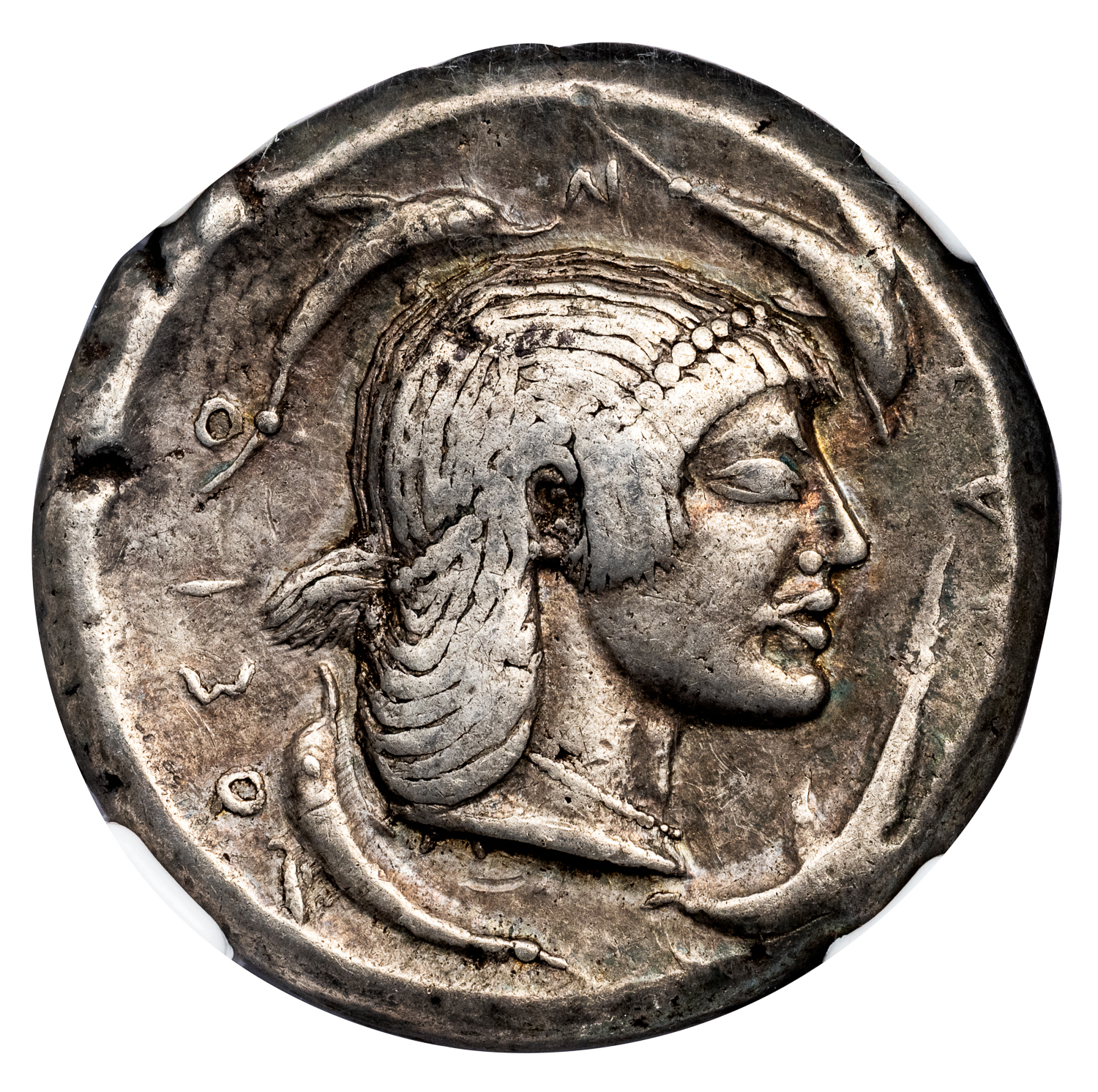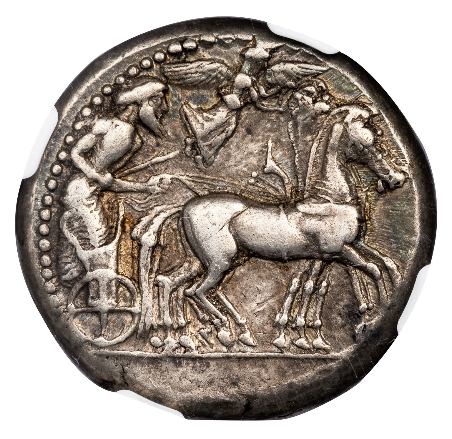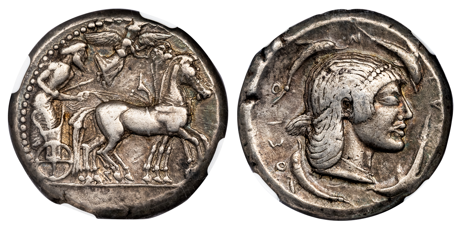 Obv. Charioteer driving quadriga right, Nike flying right, crowning horses. Rev. ΣVΡΑKΟΣΙΟN, diademed head of Arethusa right, four dolphins around.