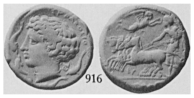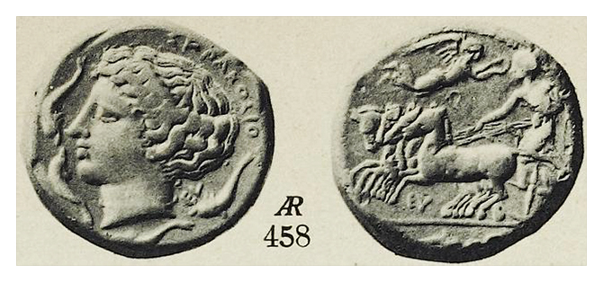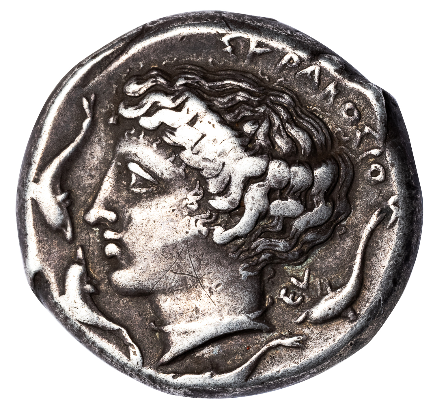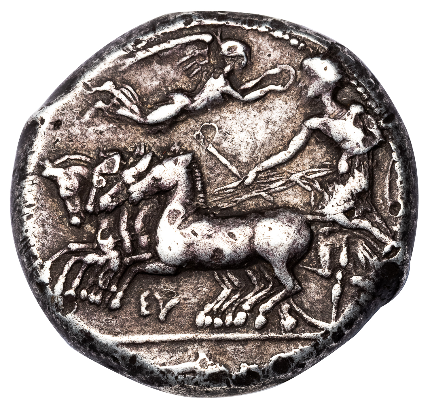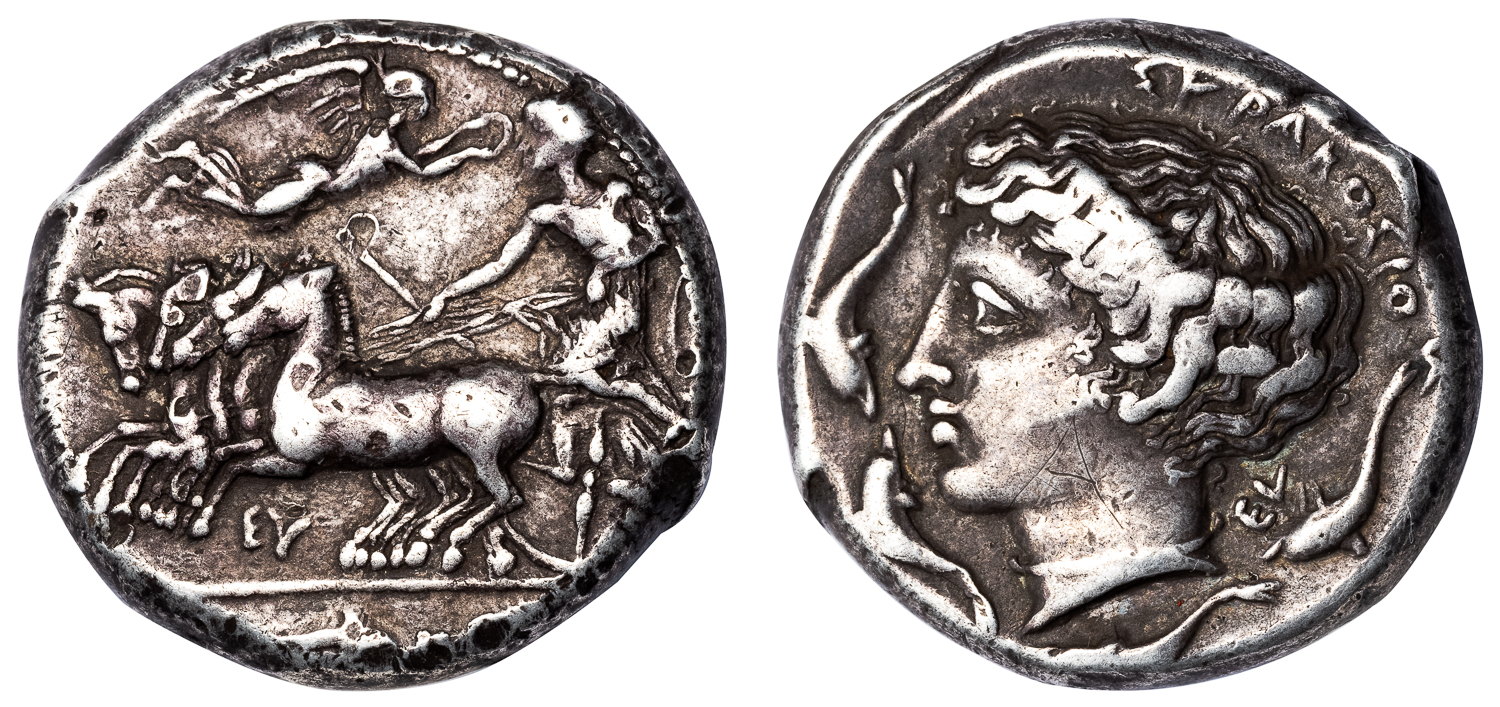 Obv. Charioteer driving quadriga left, Nike flying above right, crowning driver, EY below, pair of confronted dolphins in the exergue. Rev. ΣΥΡΑΚΟΣΙΟΝ, diademed head of Arethusa left, surrounded by four dolphins, EY in lower right field.