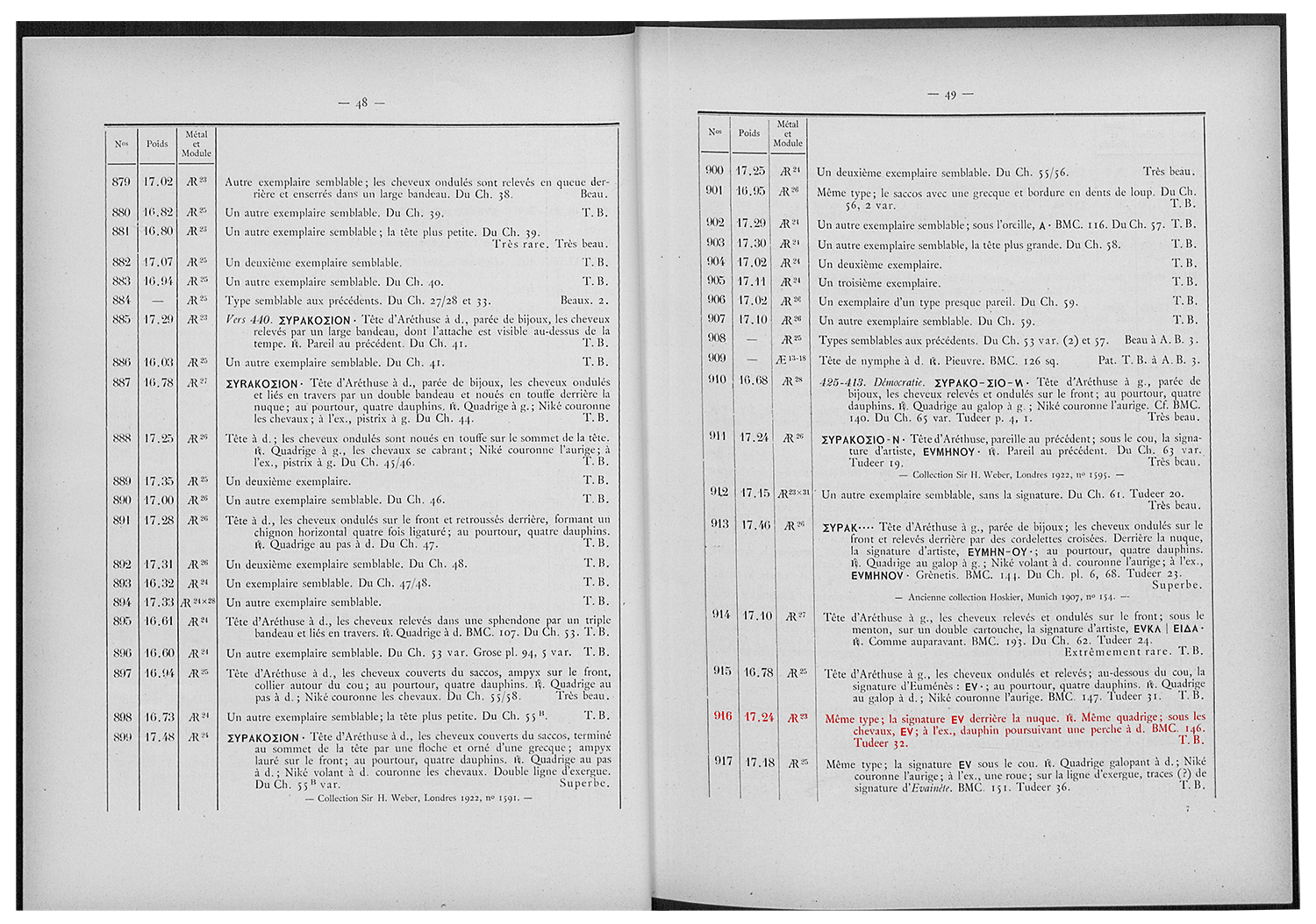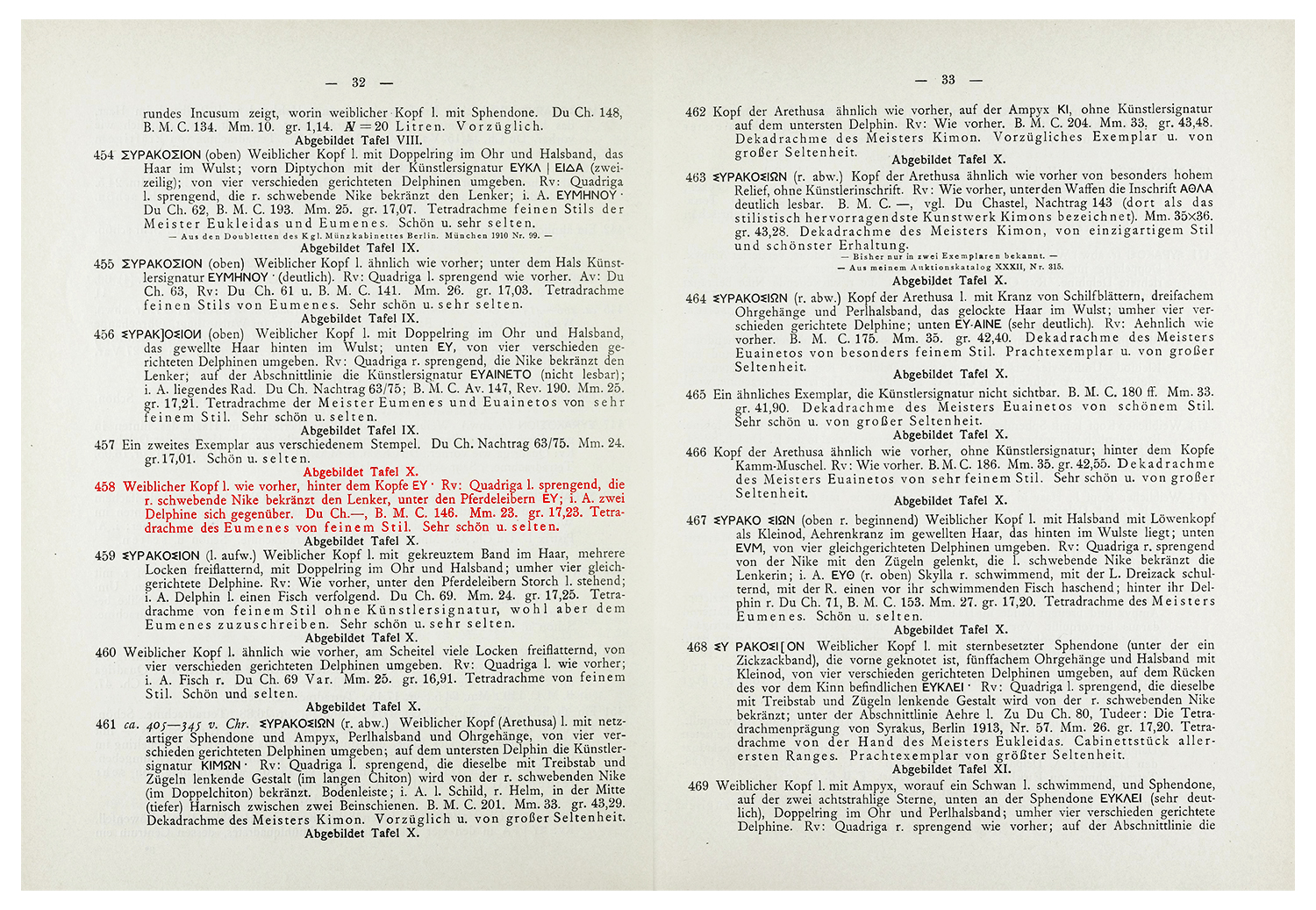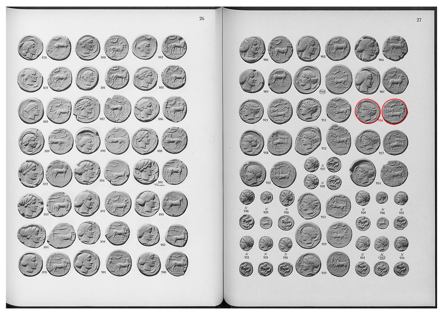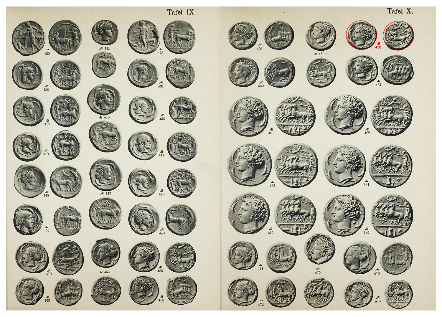 Obv. Charioteer driving quadriga left, Nike flying above right, crowning driver, EY below, pair of confronted dolphins in the exergue. Rev. ΣΥΡΑΚΟΣΙΟΝ, diademed head of Arethusa left, surrounded by four dolphins, EY in lower right field.