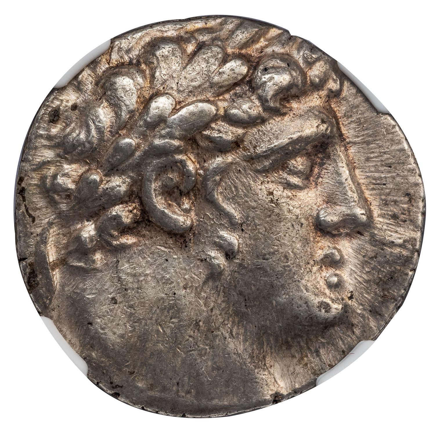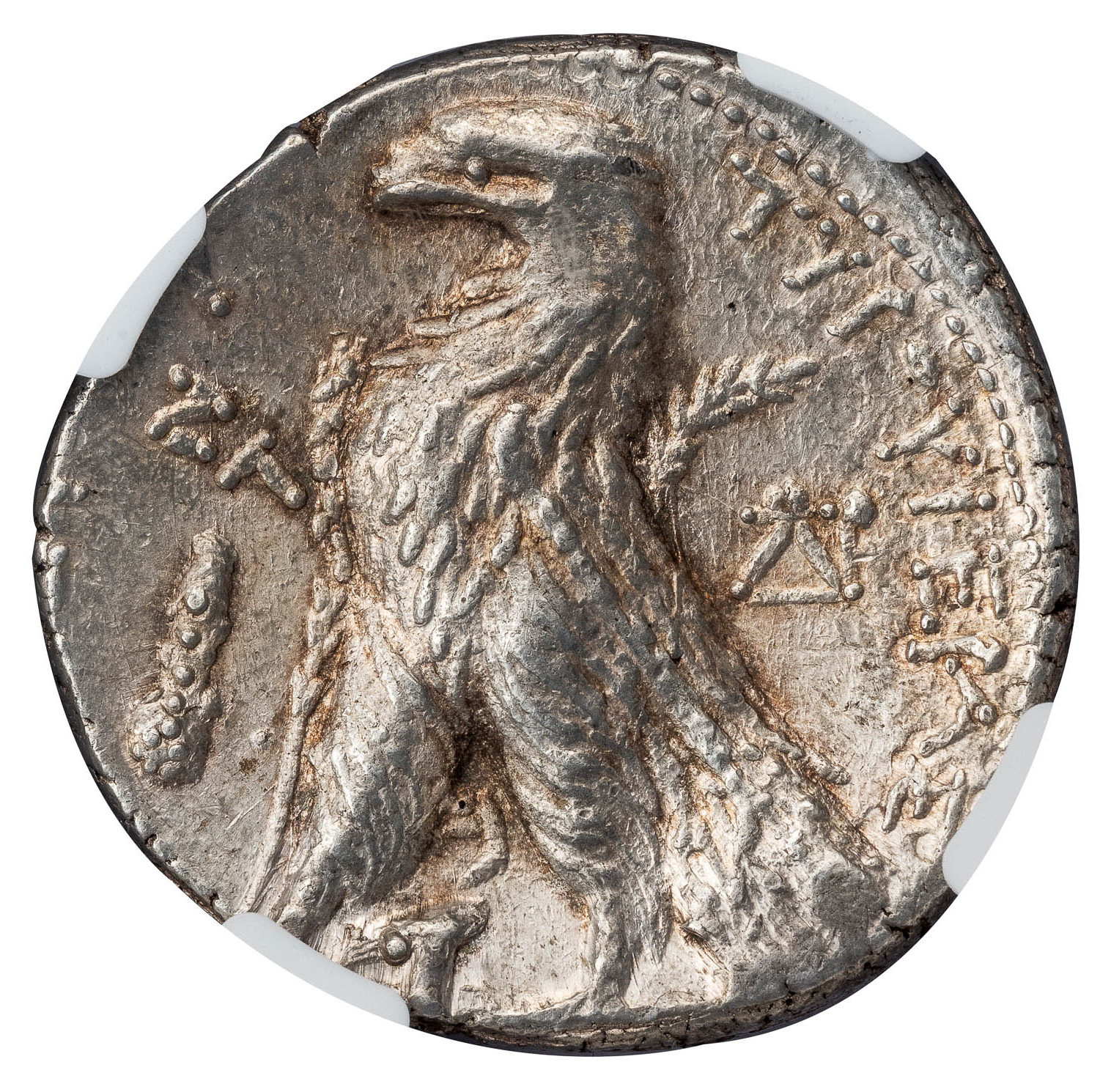 Obv. Laureate head of Melkart right, within dotted border. Rev. TYPOY IEPAΣ KAI AΣYΛOY, eagle standing left on prow, ZΛ (date) above club in left field, ΔIY control monogram in right field, Phoenician letter B between legs.