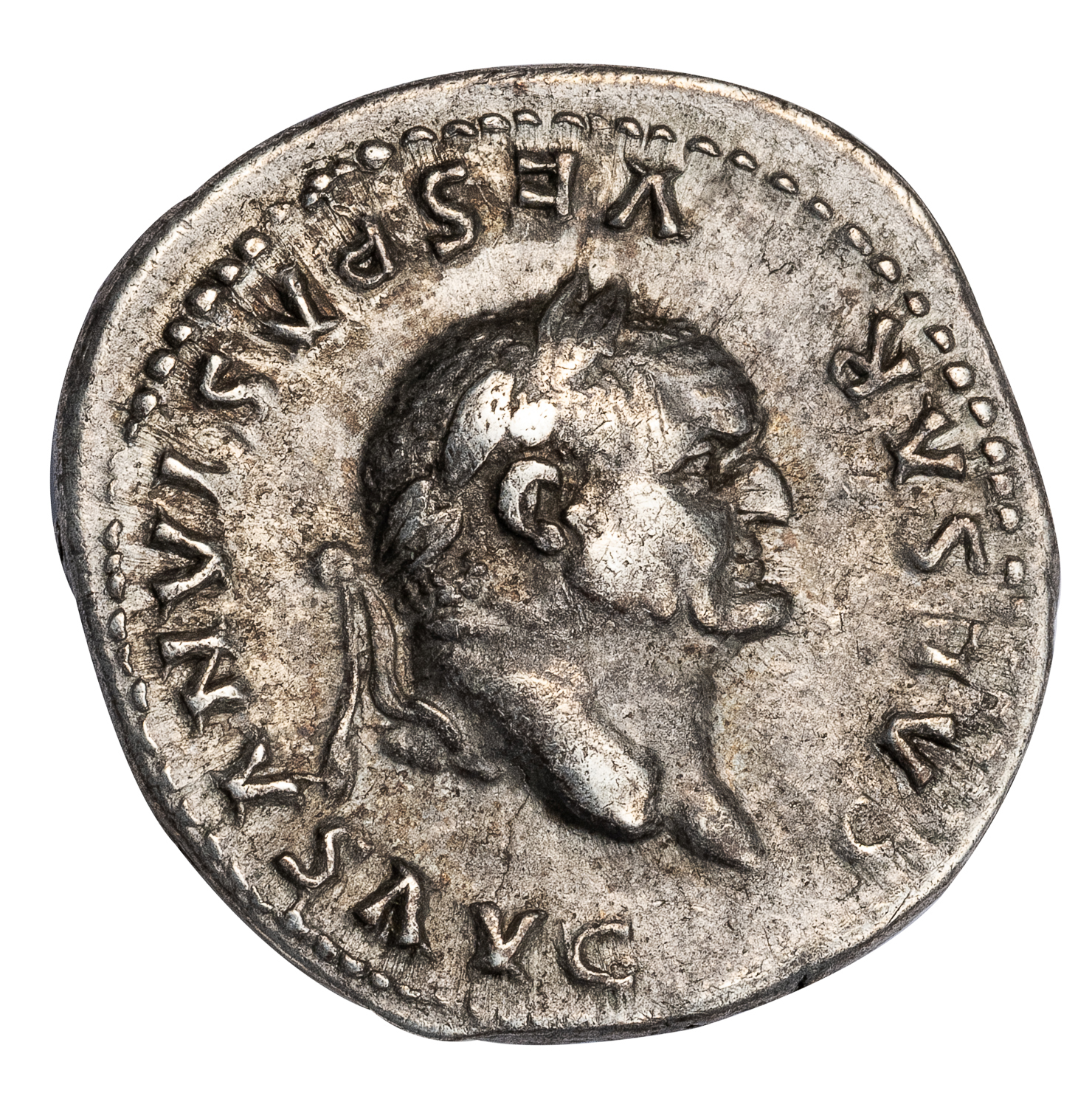 The reverse of this denarius depicts a sow with three piglets, which is thought to have been artistic shorthand for the white sow and litter of 30 piglets that indicated where Trojan hero Aeneas should found the new city of Lavinium in central Italy. According to Virgil’s Aeneid, Aeneas had brought a pregnant sow with him to sacrifice when he landed in Italy after a long sojourn at Carthage, but it escaped and gave birth to its litter beneath an oak tree. He was advised in a dream that when he found the animals, he should build his city on the site. The 30 piglets were said to foretell that 30 years later Aeneas’s son Ascanius would found the city of Alba Longa. Romulus and Remus, the founders of Rome, ultimately descended from the kings of this city. Vespasian’s reference to the sow on his coinage may perhaps allude to his building program in Rome after the Civil War of AD 69, which gave him the character of a second founder, following in the footsteps of Aeneas, Ascanius, and Romulus.