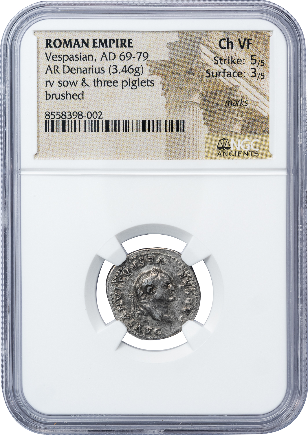 VESPASIAN SILVER DENARIUS – LAVINIAN SOW ISSUE – CHOICE VF NGC GRADED ROMAN IMPERIAL COIN OF THE 12 CAESARS (Inv. 20420)
