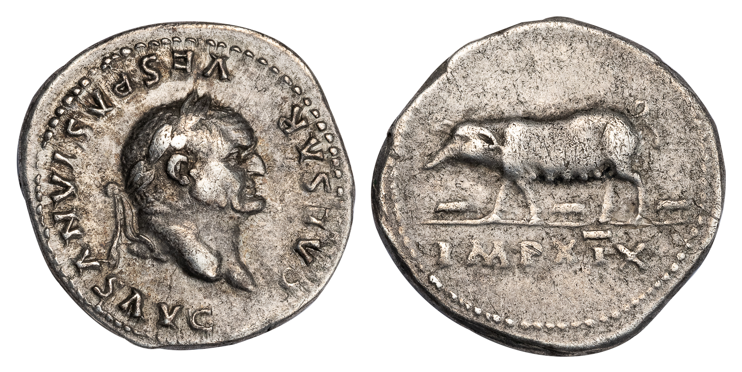 Obv. CAESAR VESPASIANVS AVG, laureate head of Vespasian right. Rev. IMP XIX, sow left, accompanied by three piglets.