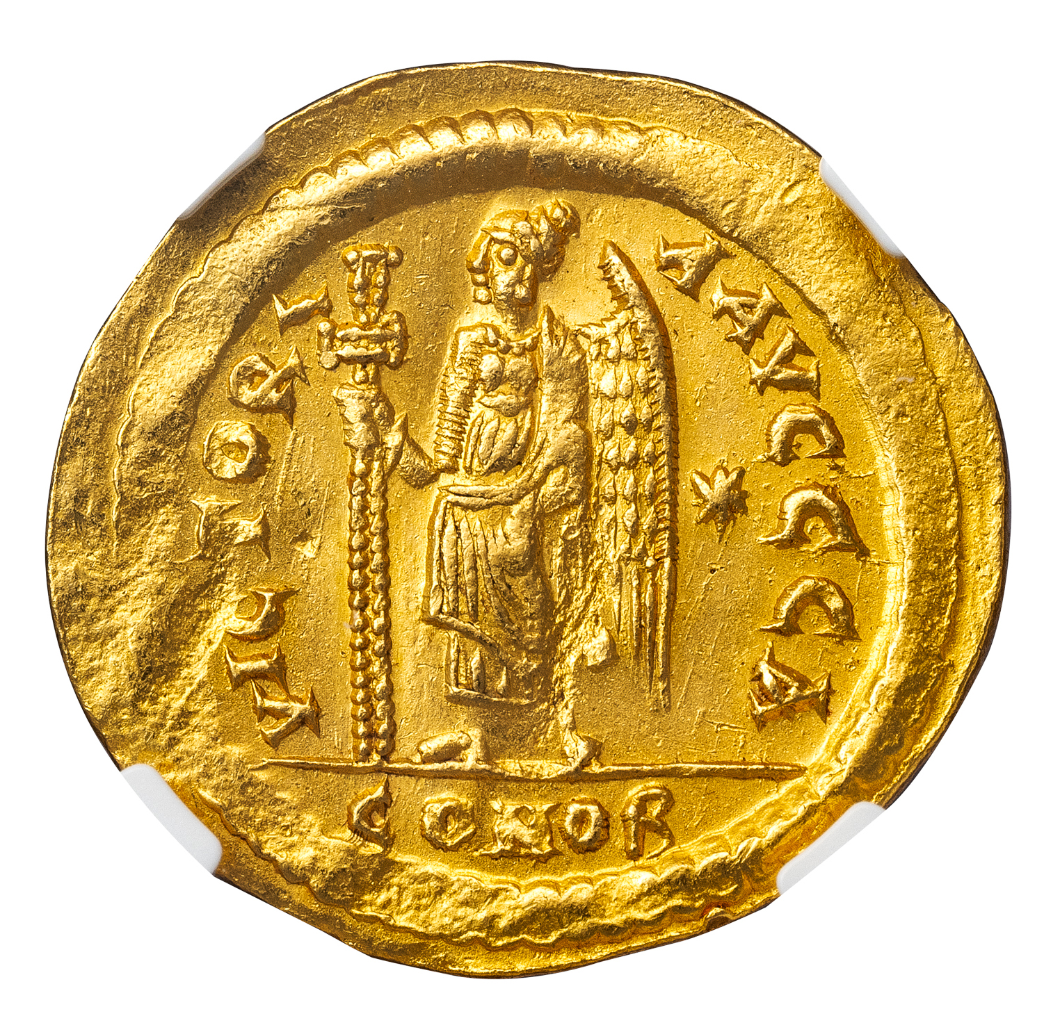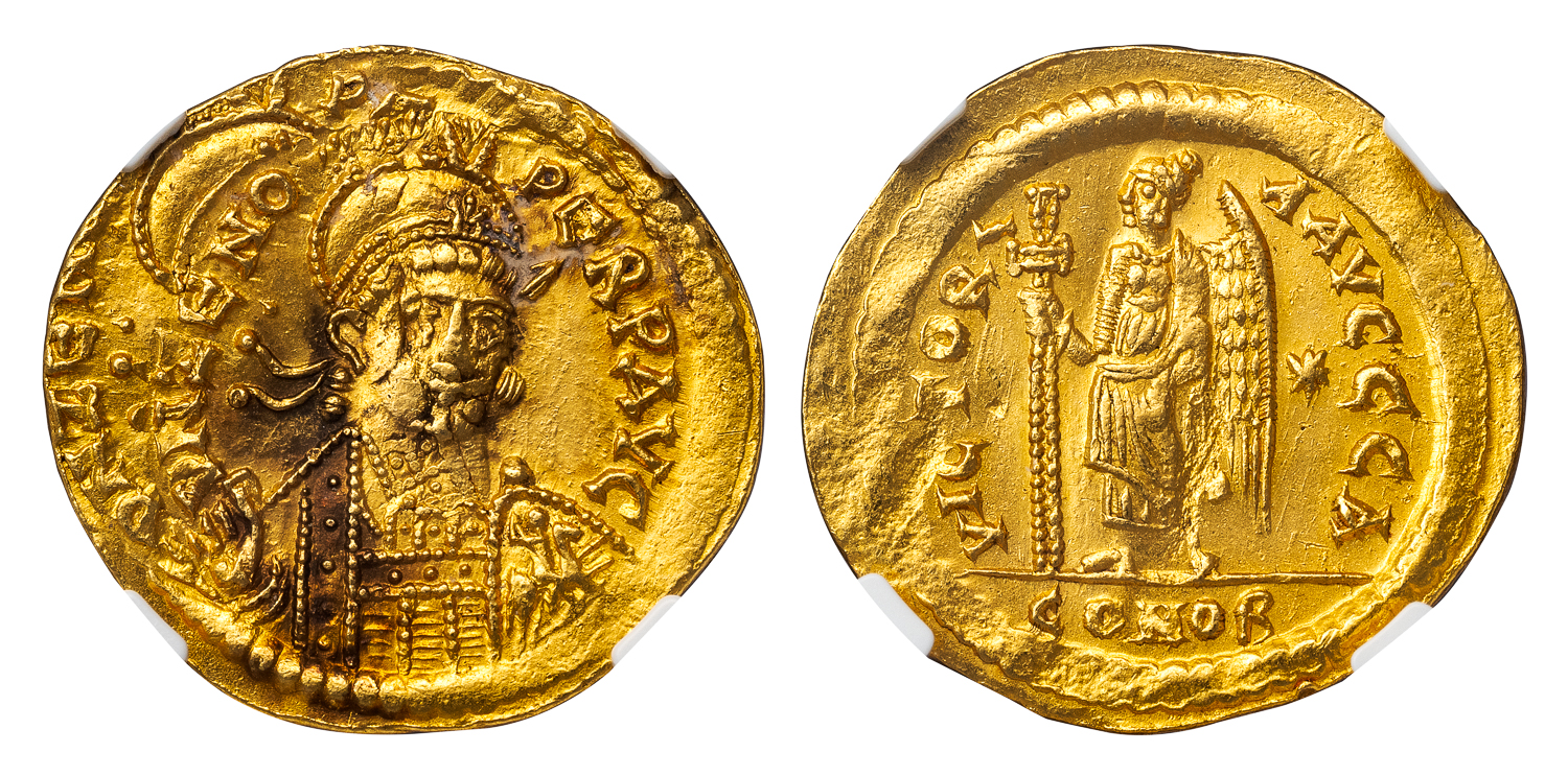 Obv. D N ZENO PERP AVG, helmeted and cuirassed bust of Zeno three quarters right, holding spear and shield with horseman device. Rev. VICTORIA AVGGG Z, Victory standing left, holding jeweled cross, star in left field, CONOB in exergue.